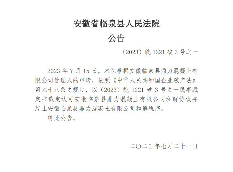 7月21日,安徽省臨泉縣人民法院公告,本院根據(jù)安徽臨泉縣鼎力混凝土有限公司管理人的申請,依照《中華人民共和國企業(yè)破產(chǎn)法》第九十八條之規(guī)定,以(2023)皖 1221 破 3 號之一民事裁定書裁定認(rèn)可安徽臨泉縣鼎力混凝土有限公司和解協(xié)議并終止安徽臨泉縣鼎力混凝土有限公司和解程序.