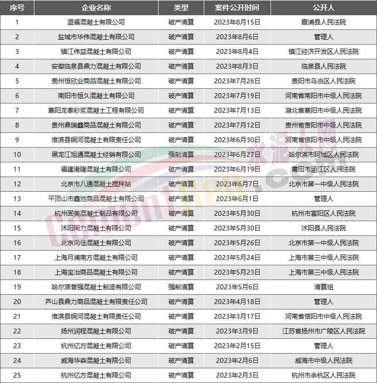 25家混凝土企業(yè)宣布破產(chǎn)或進(jìn)入破產(chǎn)程序