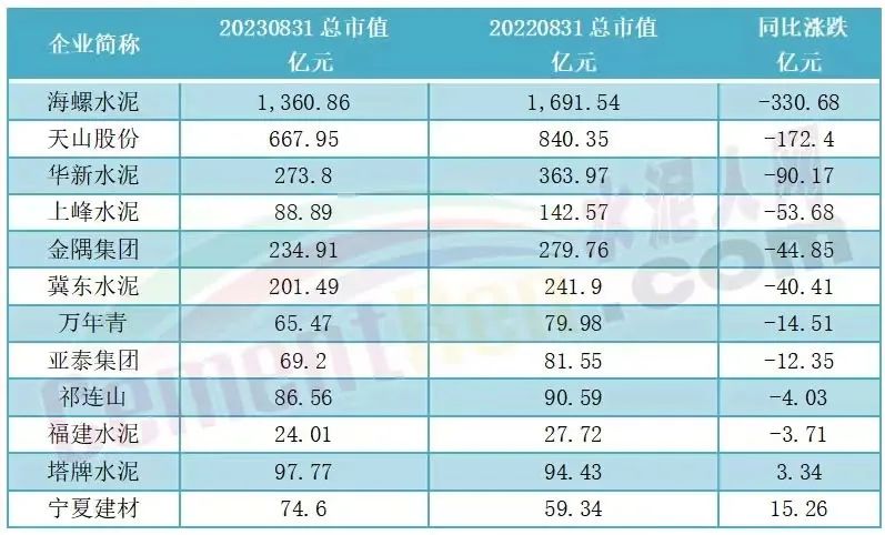 對比部分上市企業(yè)2022年同比市值下跌情況可見,近一年來包括海螺水泥、冀東水泥、華新水泥等企業(yè)在內(nèi)的10家企業(yè)市值下滑合計達766.79億元,其中海螺水泥一年內(nèi)總市值下滑達330.68億元。