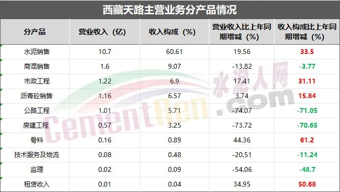 截止2023年上半年,西藏天路水泥銷售營業(yè)收入同比去年增加19.56%,收入構(gòu)成同比去年增加33.5%;骨料營業(yè)收入同比去年增加44.36%,收入構(gòu)成同比去年增加61.2%。