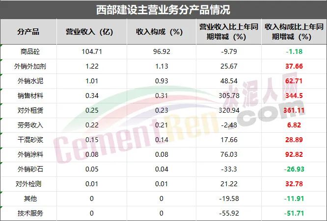 今年上半年,西部建設(shè)仍以預(yù)拌混凝土生產(chǎn)為核心,輻射水泥、外加劑、商品砂漿、砂石骨料、物流運輸、技術(shù)研發(fā)與服務(wù)、檢測、資源綜合利用、電子商務(wù)等業(yè)務(wù),基本建立了“技術(shù)研發(fā)+資源儲備+生產(chǎn)+銷售+服務(wù)”的產(chǎn)業(yè)鏈條。同時,外銷外加劑、外銷水泥、銷售材料、對外租賃等業(yè)務(wù)板塊營業(yè)收入及收入構(gòu)成同比去年均有所增長。