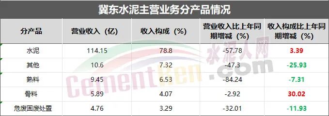今年上半年,冀東水泥各產(chǎn)品業(yè)務(wù)營業(yè)收入同比去年均有所減少,但水泥和骨料營收收入占比同比去年有所增加,其中,骨料營收收入占比同比去年增加30.02%。據(jù)水泥人網(wǎng)了解,冀東水泥主要業(yè)務(wù)及產(chǎn)能公司及子公司的主要業(yè)務(wù)為硅酸鹽水泥、熟料及相關(guān)建材產(chǎn)品的制造和銷售,同時涵蓋砂石骨料、危固廢處置、外加劑等產(chǎn)業(yè)(業(yè)務(wù))。