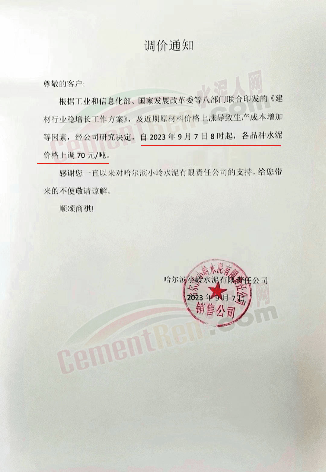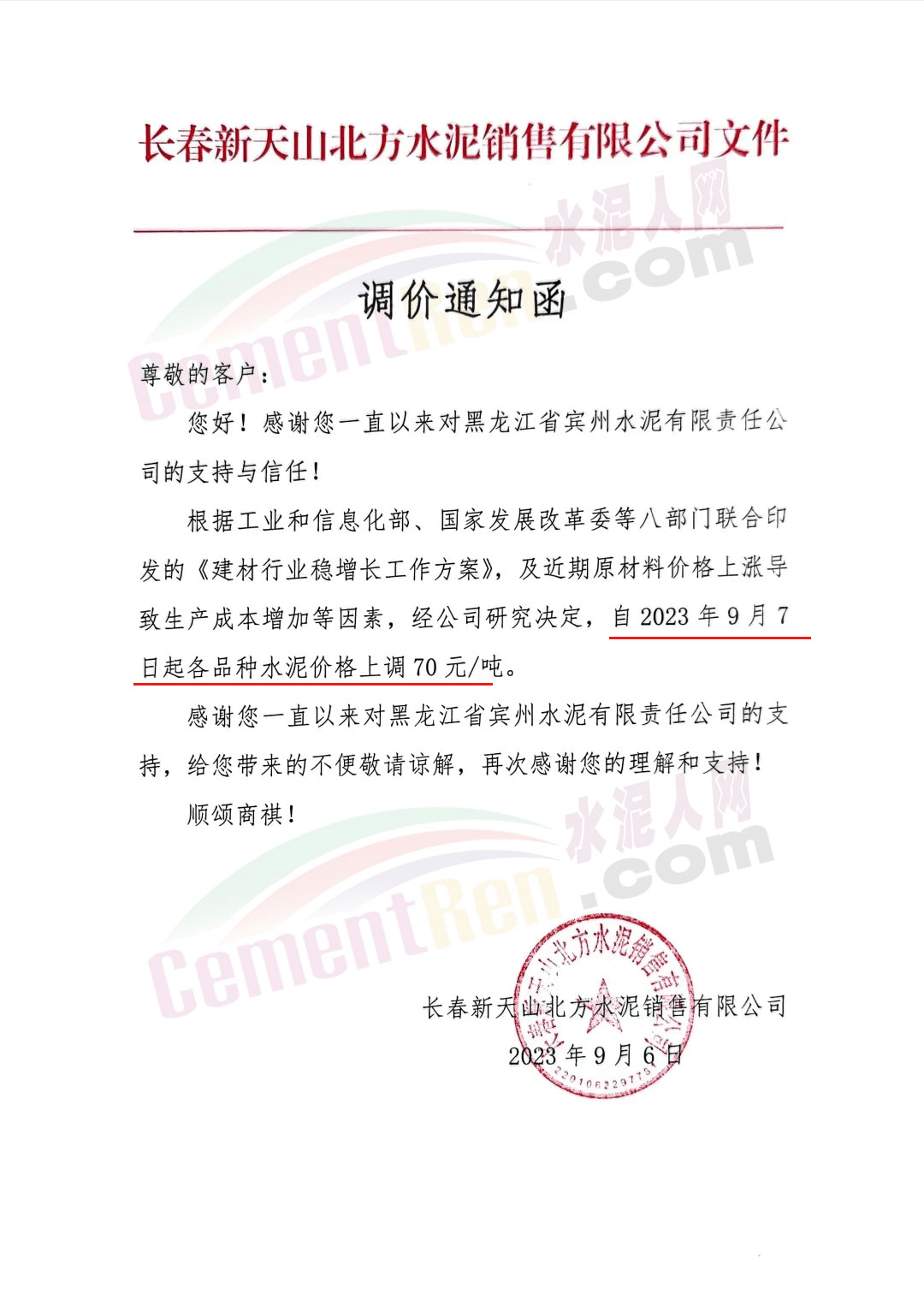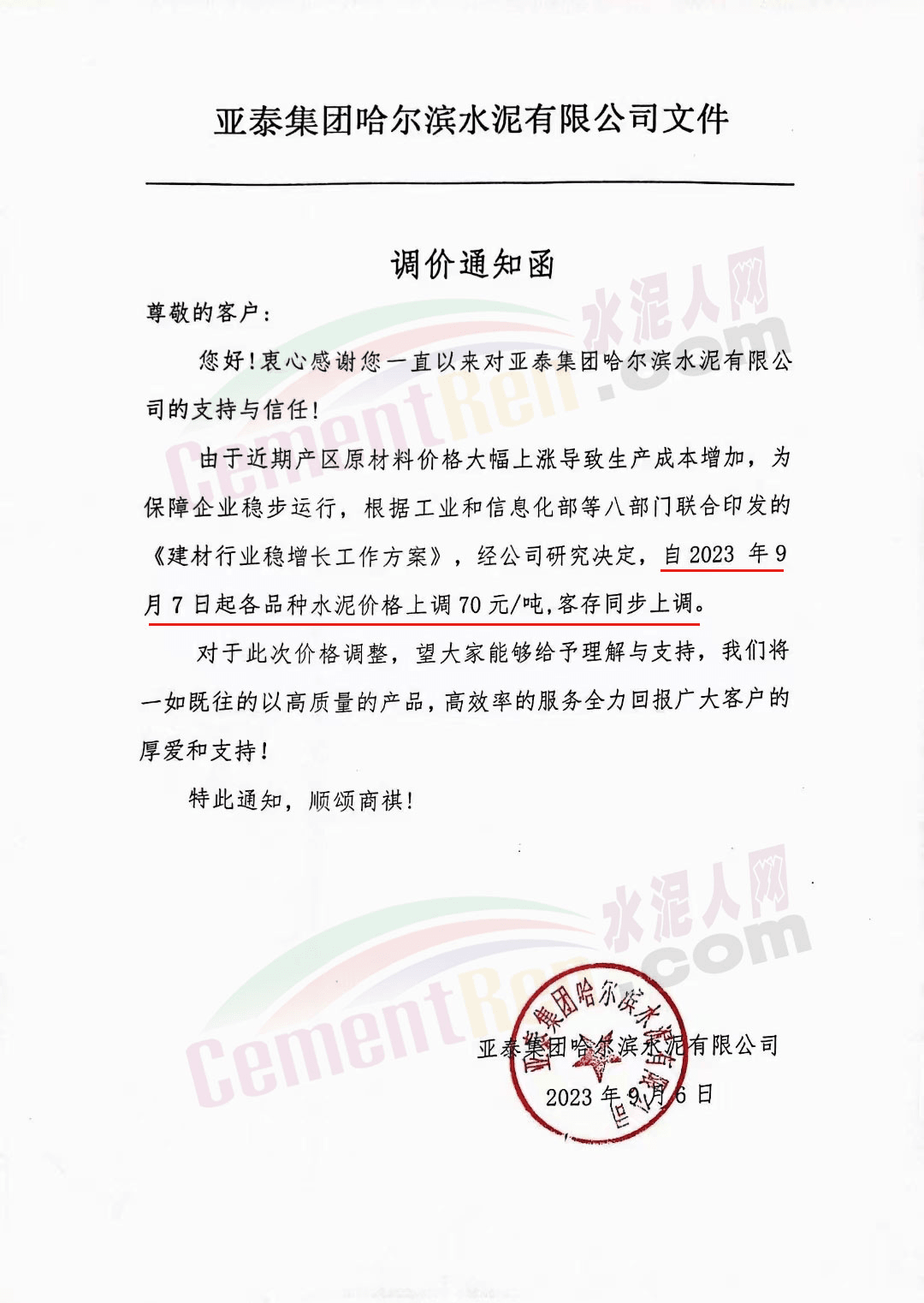 日前,亞泰集團(tuán)哈爾濱水泥有限公司通知,由于近期產(chǎn)區(qū)原材料價(jià)格大幅上漲導(dǎo)致生產(chǎn)成本增加,為保障企業(yè)穩(wěn)步運(yùn)行,根據(jù)工業(yè)和信息化部等八部門(mén)聯(lián)合印發(fā)的《建材行業(yè)穩(wěn)增長(zhǎng)工作方案》,經(jīng)公司研究決定,自2023年9月7日起各品種水泥價(jià)格上調(diào)70元/噸,客存同步上調(diào)。