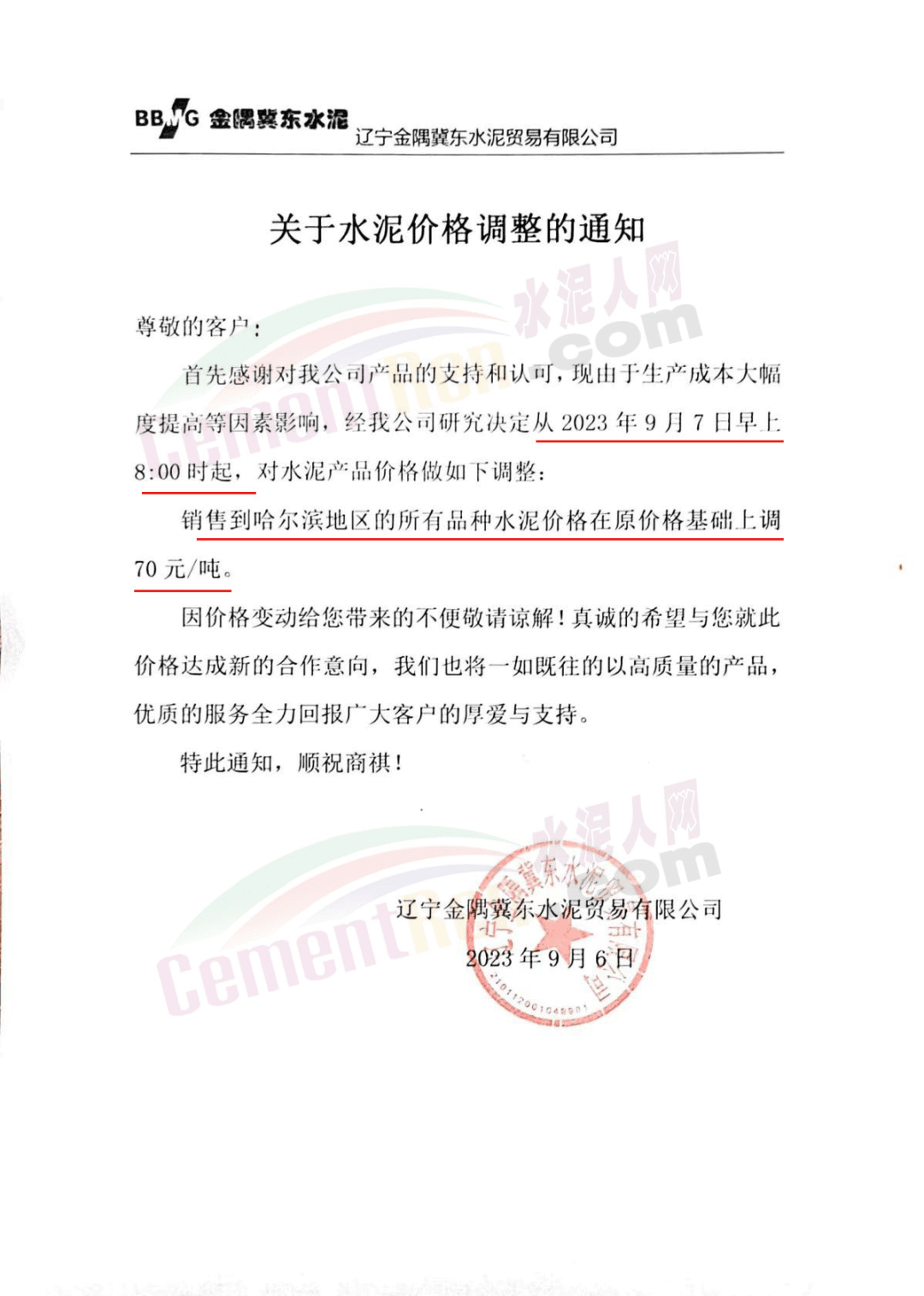 遼寧金隅冀東水泥貿(mào)易有限公司通知,由于生產(chǎn)成本大幅度提高等因素影響,經(jīng)公司研究決定從2023年9月7日早上8時(shí)起,對(duì)銷(xiāo)售到哈爾濱地區(qū)的所有品種水泥價(jià)格在原價(jià)格基礎(chǔ)上上調(diào)70元/噸。
