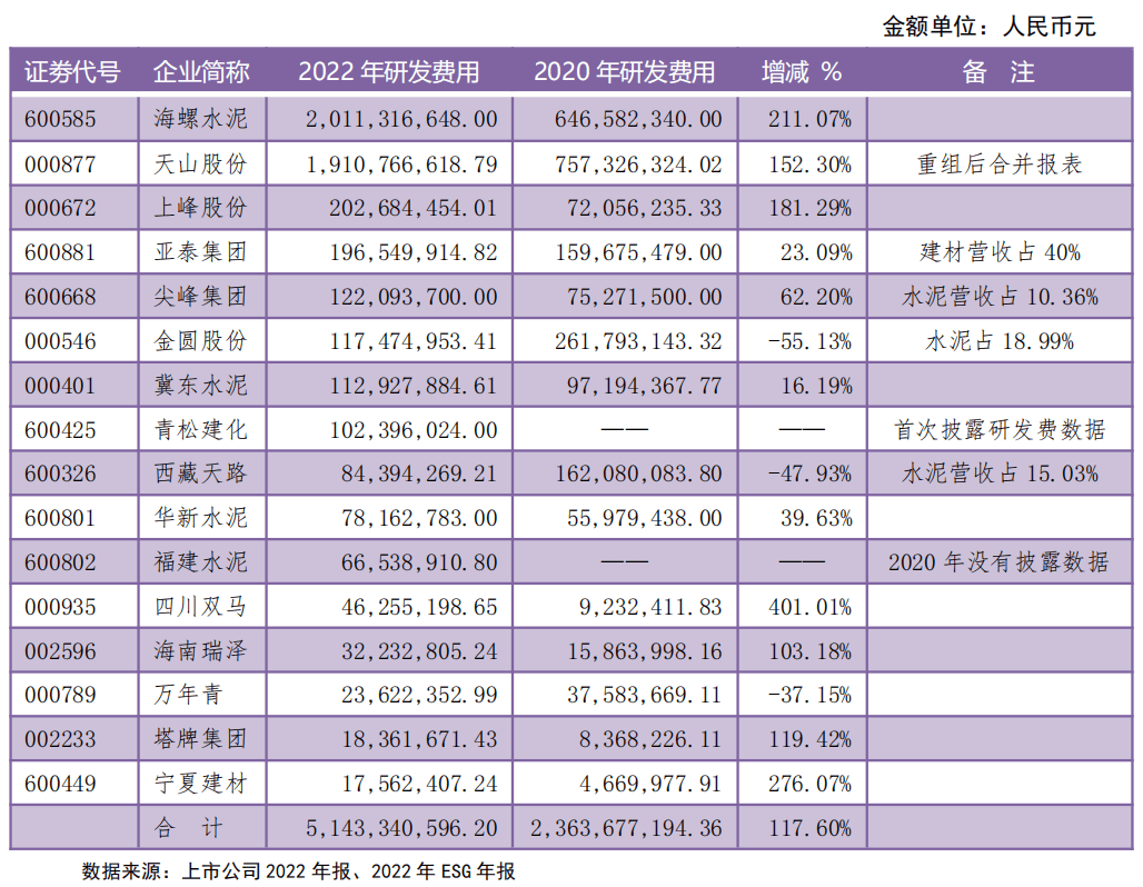 表3 水泥A股上市公司2022與2020年企業(yè)研發(fā)費用數(shù)據(jù)