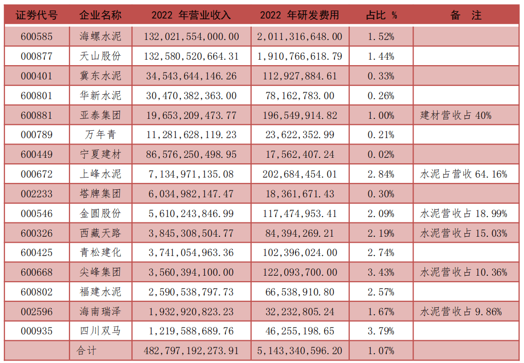 表4 部分水泥上市公司2022年度企業(yè)研發(fā)費占比數(shù)據(jù)