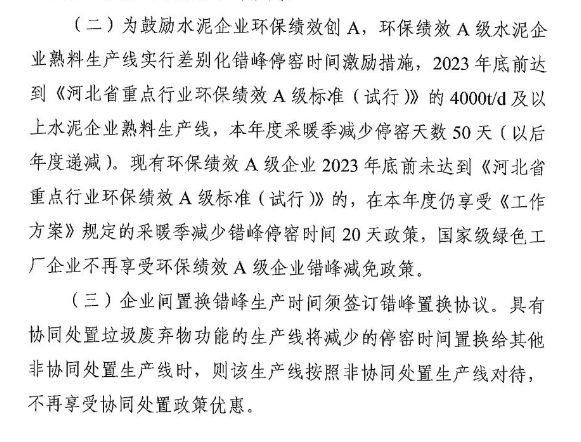 在2023年底前達(dá)A級標(biāo)準(zhǔn)的企業(yè)不僅要停窯,而且減免措施僅限擁有4000t/d及以上企業(yè);國家級綠色工廠不再享受錯(cuò)峰減免政策。調(diào)整錯(cuò)峰生產(chǎn)時(shí)間和保民生的協(xié)同處置項(xiàng)目也必須在規(guī)定的時(shí)間段內(nèi)補(bǔ)齊等。