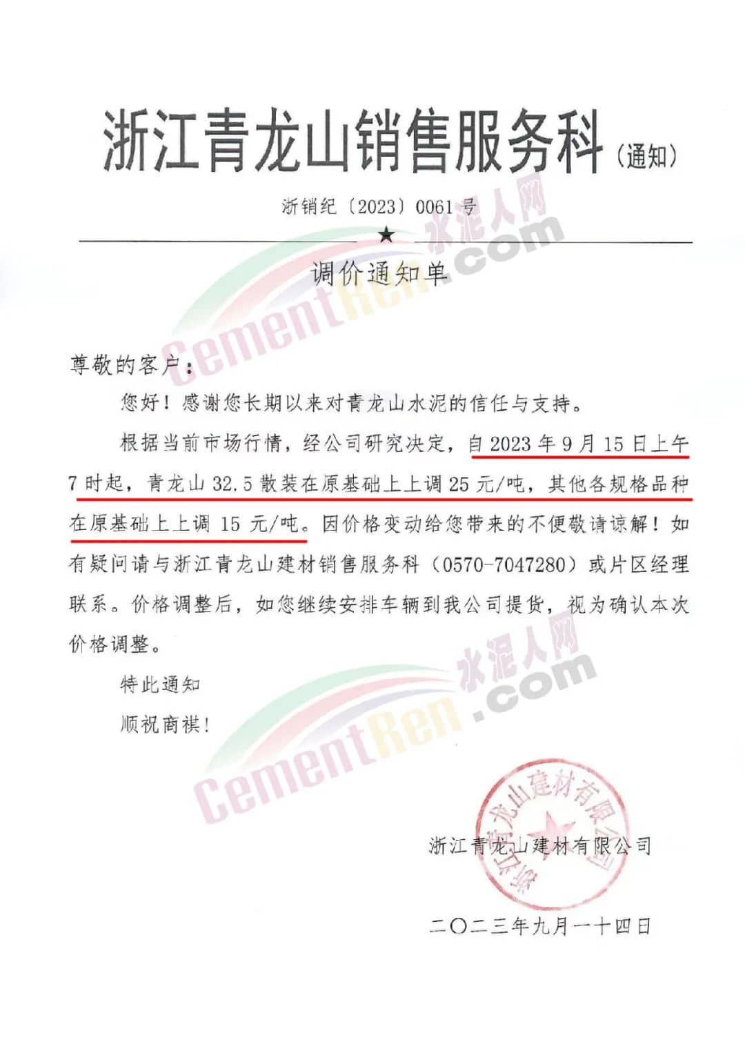 同期,紅獅水泥旗下浙江青龍山銷售服務(wù)科通知,根據(jù)當(dāng)前市場行情,經(jīng)公司研究決定,自2023年9月15日上午7時(shí)起,青龍山32.5散裝在原基礎(chǔ)上上調(diào)25元/噸,其他各規(guī)格品種在原基礎(chǔ)上上調(diào)15元/噸。