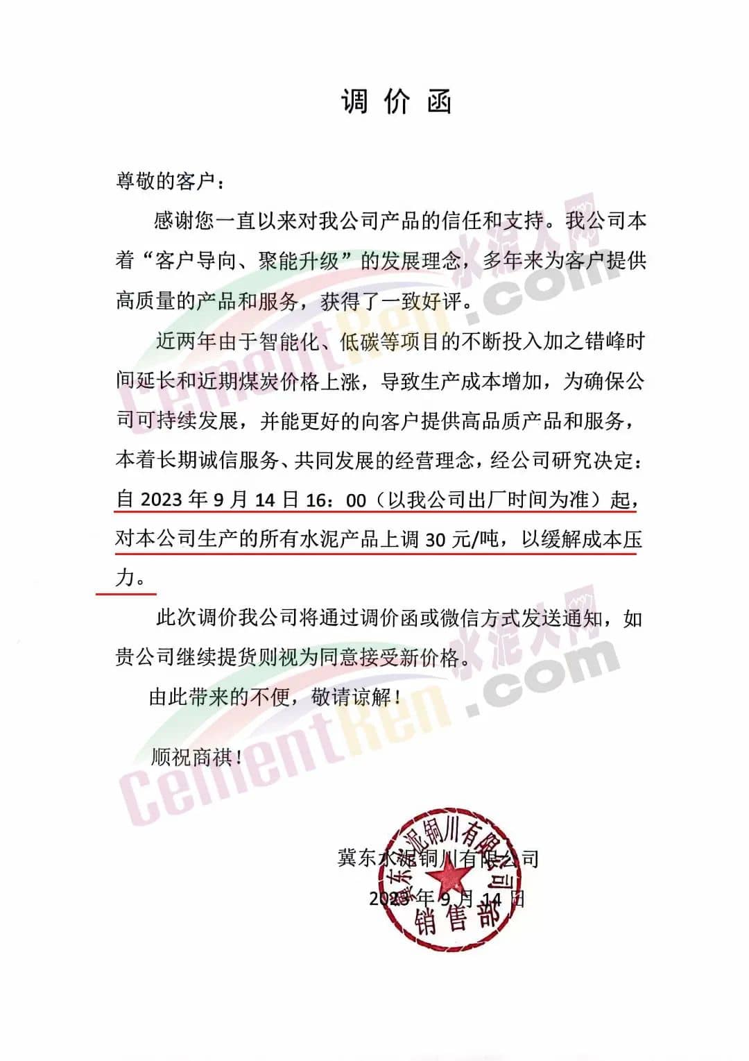 陜西冀東水泥銅川公司通知,近兩年由于智能化、低碳等項(xiàng)目的不斷投入加之錯(cuò)峰時(shí)間延長和近期煤炭價(jià)格上漲,導(dǎo)致生產(chǎn)成本增加,為確保公司可持續(xù)發(fā)展,并能更好的向客戶提供高品質(zhì)產(chǎn)品和服務(wù),本著長期誠信服務(wù)、共同發(fā)展的經(jīng)營理念,經(jīng)公司研究決定自2023年9月14日16時(shí)起,對本公司生產(chǎn)的所有水泥產(chǎn)品上調(diào)30元/噸,以緩解成本壓力。