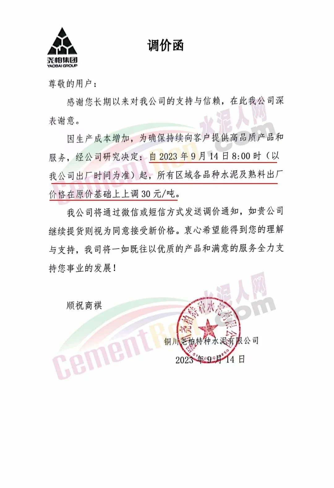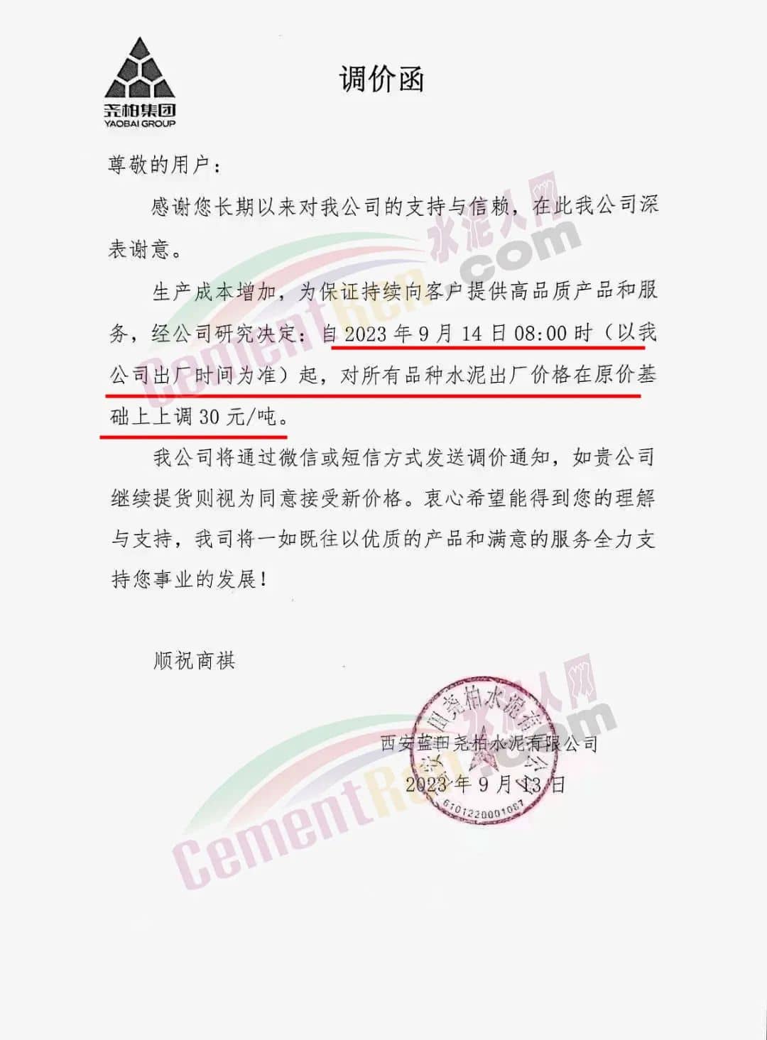 西安藍(lán)堯柏水泥有限公司通知,生產(chǎn)成本增加,為保證持續(xù)向客戶提供高品質(zhì)產(chǎn)品和服務(wù),經(jīng)公司研究決定,自2023年9月14日8時(shí)起,對所有品種水泥出廠價(jià)格在原價(jià)基礎(chǔ)上上調(diào)30元/噸。