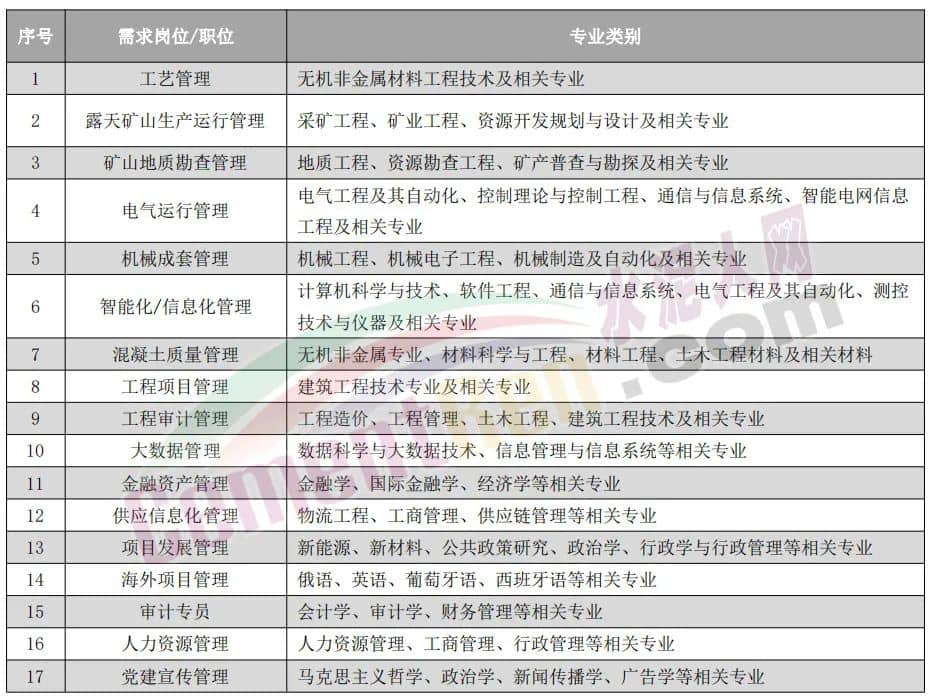 日前,安徽省大中專畢業(yè)生就業(yè)指導(dǎo)中心官網(wǎng)發(fā)布了《海螺水泥2024年秋季校園招聘簡(jiǎn)章》招聘崗位包含工藝管理、露天礦山生產(chǎn)運(yùn)行管理、礦山地質(zhì)勘查管理、電氣運(yùn)行管理、機(jī)械成套管理、智能化/信息化管理、混凝土質(zhì)量管理、金融資產(chǎn)管理、供應(yīng)信息化管理、項(xiàng)目發(fā)展管理、海外項(xiàng)目管理等多個(gè)崗位。