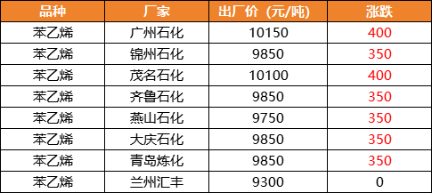 9月以來(lái),苯乙烯漲超1000元/噸,期貨市場(chǎng)日內(nèi)大漲3.45%,多家化工企業(yè)苯乙烯出廠價(jià)大漲350-400元/噸,廣州石化和茂名石化出廠價(jià)已漲破10000元/噸。