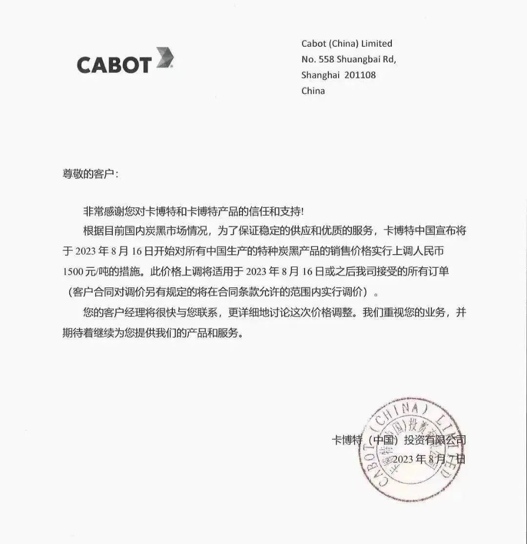 8月份開始,炭黑價(jià)格觸底反彈。目前橡膠用炭黑價(jià)格已經(jīng)突破一萬(wàn)大關(guān),且還呈現(xiàn)往上飆升的態(tài)勢(shì)。2023年9月15日炭黑價(jià)格為11000元/噸左右,并且還有繼續(xù)上漲之勢(shì)。炭黑龍頭卡博特宣布對(duì)所有中國(guó)生產(chǎn)的特種炭黑產(chǎn)品的銷售價(jià)格實(shí)行上調(diào)人民幣1500元/噸。