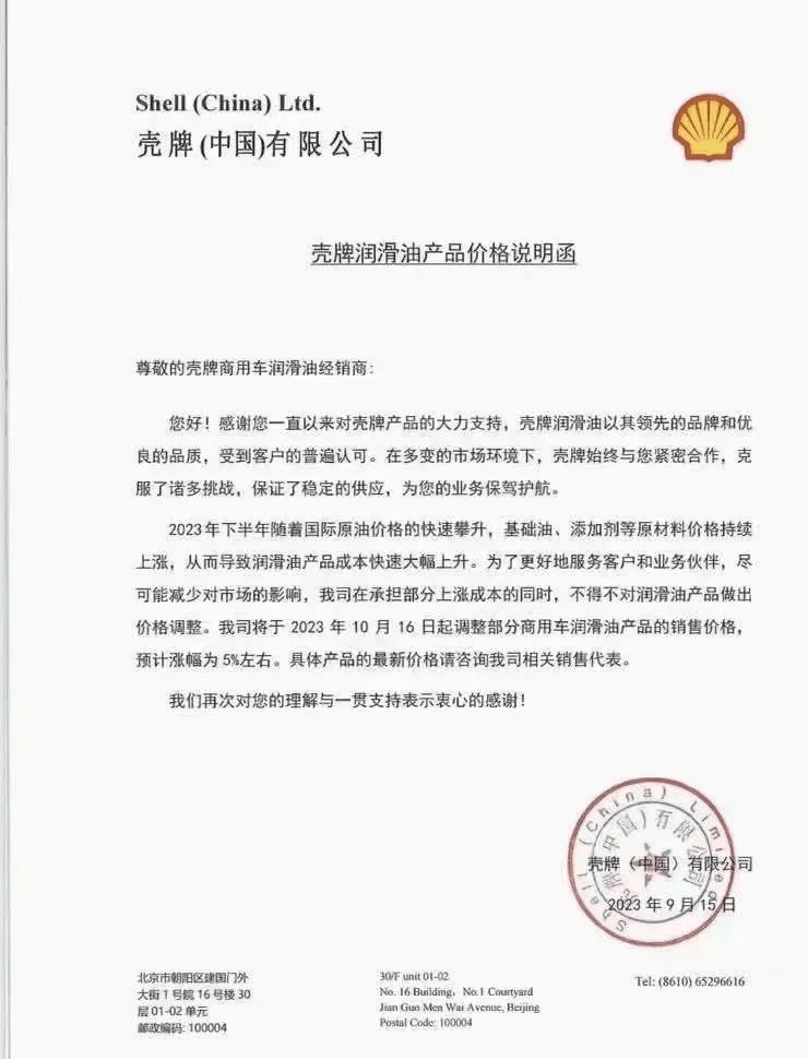 近日,勝牌、殼牌和突破潤(rùn)滑油發(fā)布了關(guān)于調(diào)整潤(rùn)滑油產(chǎn)品價(jià)格通告,宣布對(duì)產(chǎn)品價(jià)格進(jìn)行適度上調(diào),預(yù)計(jì)漲幅為5%左右。
