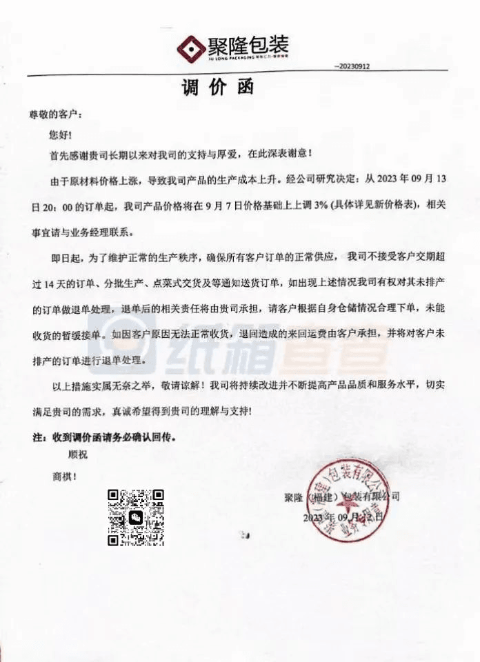 聚隆(福建)包裝:從2023年9月13日20:00的訂單起,將在9月7日價(jià)格基礎(chǔ)上上調(diào)3%。
