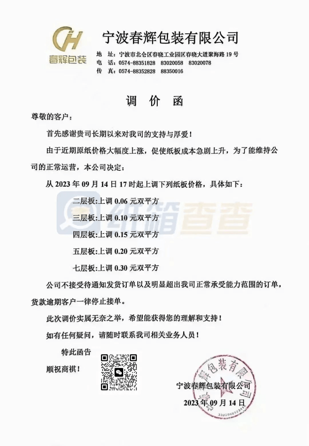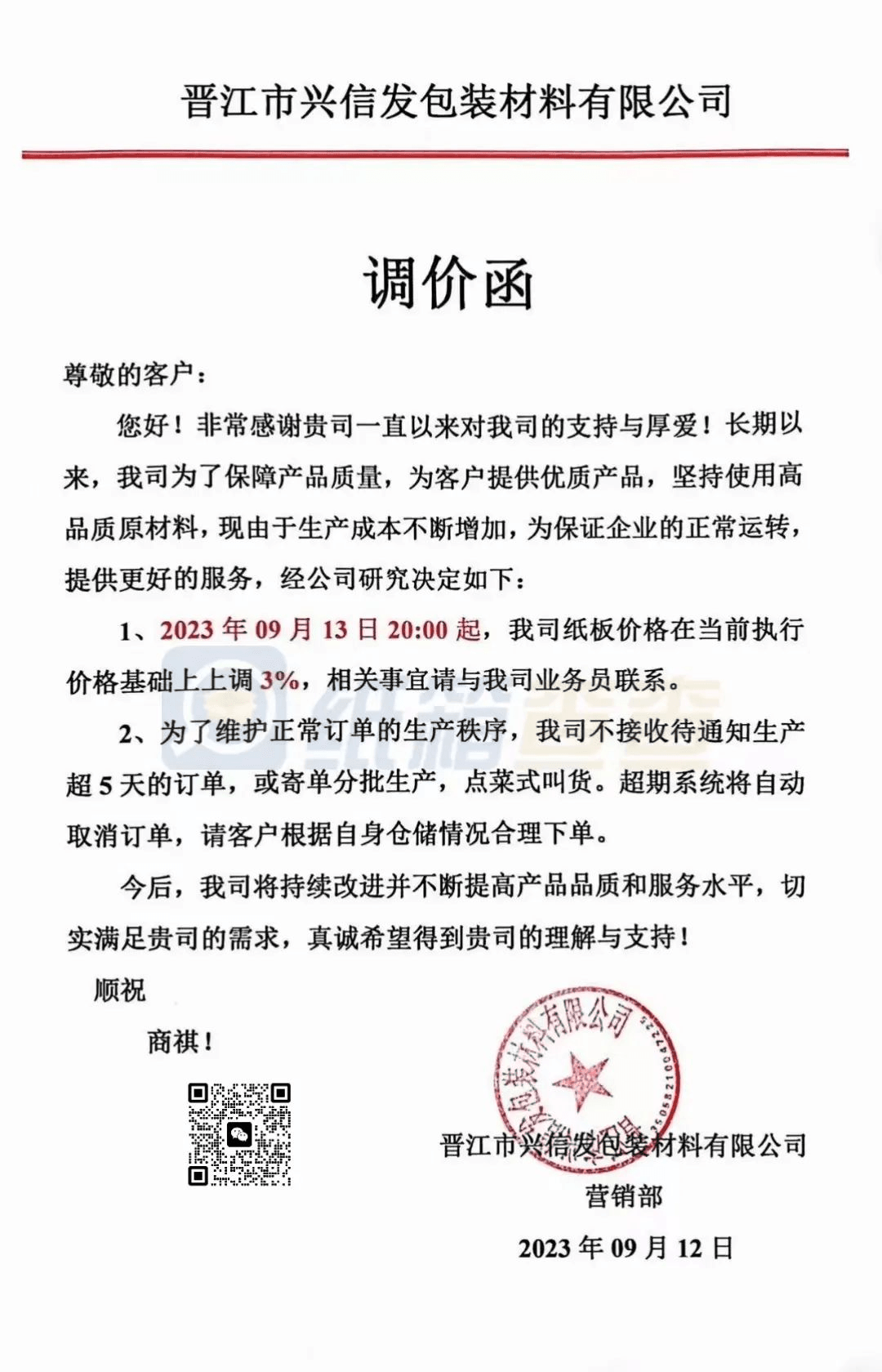 南安市恒發(fā)紙品包裝:從2023年9月13日20時(shí)起,產(chǎn)品銷售價(jià)格在原有價(jià)格基礎(chǔ)上上調(diào)3%。