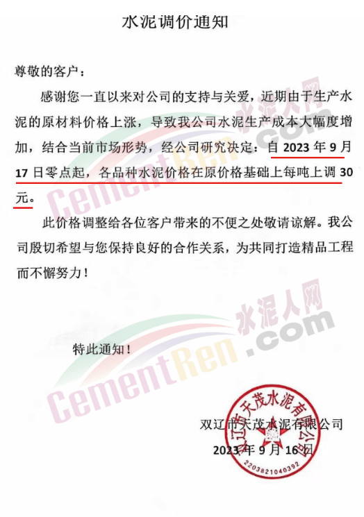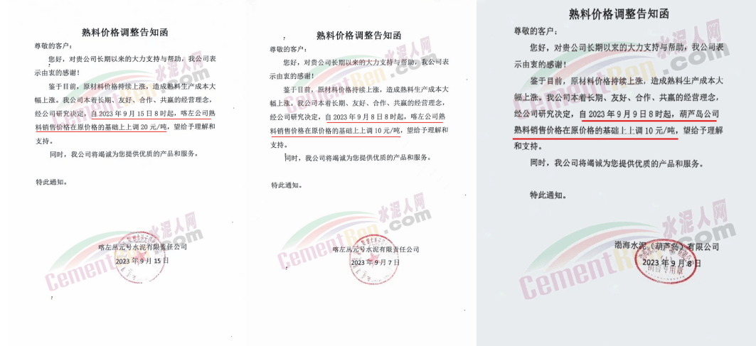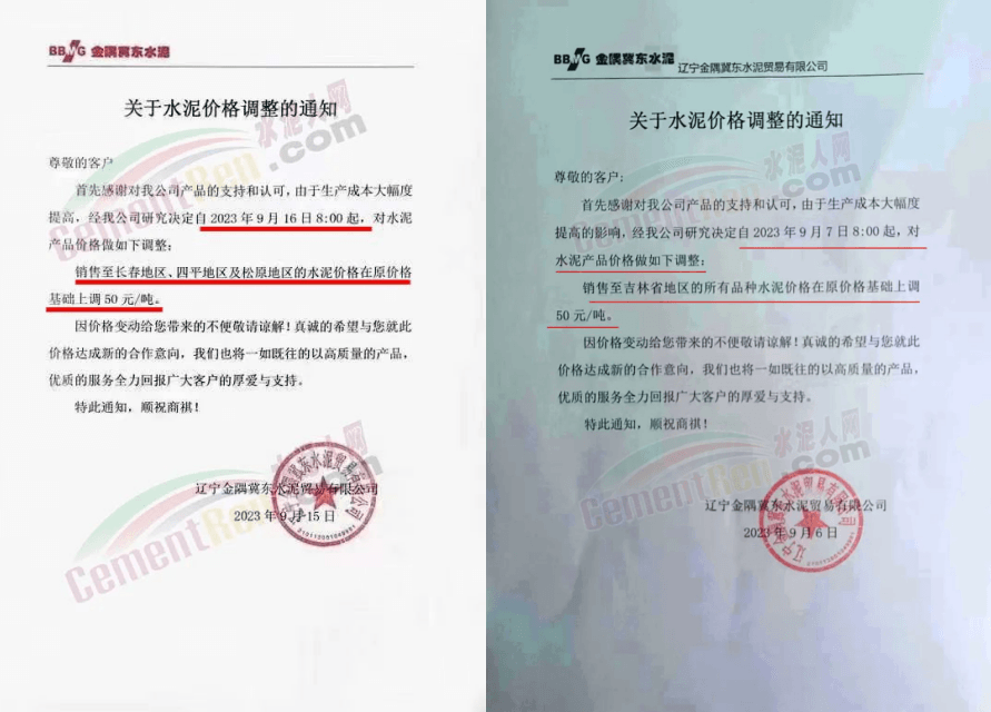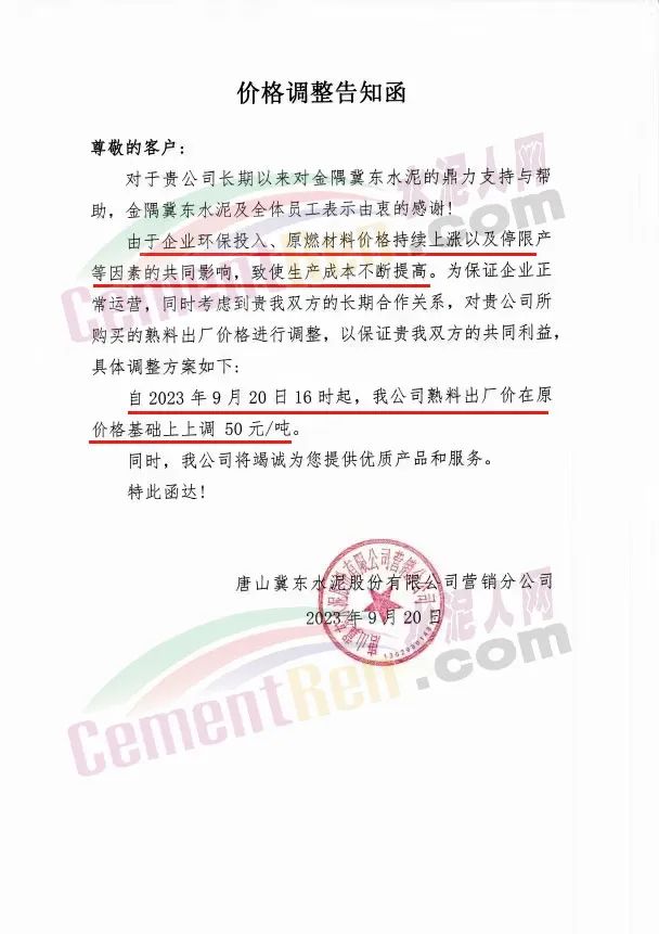 唐山冀東水泥股份有限公司營銷分公司通知,由于企業(yè)環(huán)保投入、原燃材料價格持續(xù)上漲以及停限產(chǎn)等因素的共同影響,致使生產(chǎn)成本不斷提高。為保證企業(yè)正常運(yùn)營,自2023年9月20日16時起,熟料出廠價在原價格基礎(chǔ)上上調(diào)50元/噸。