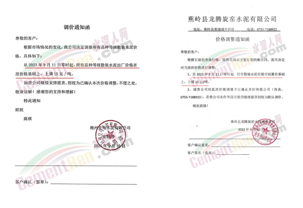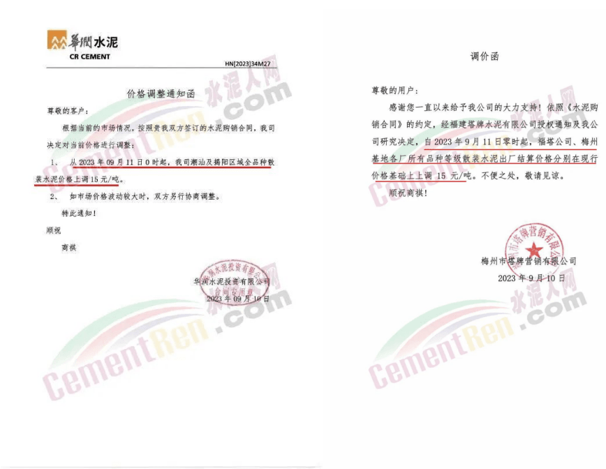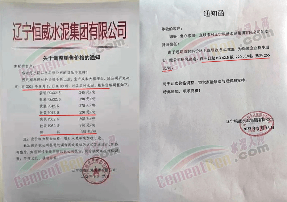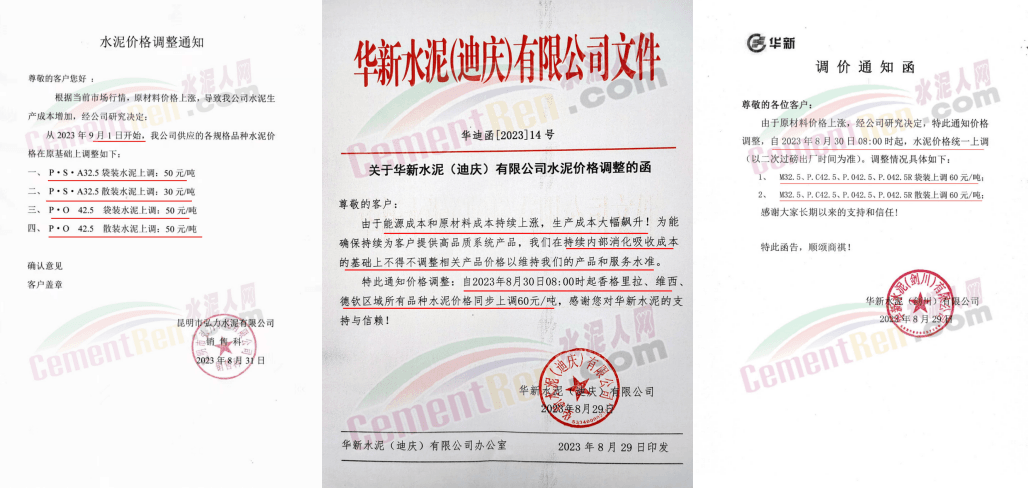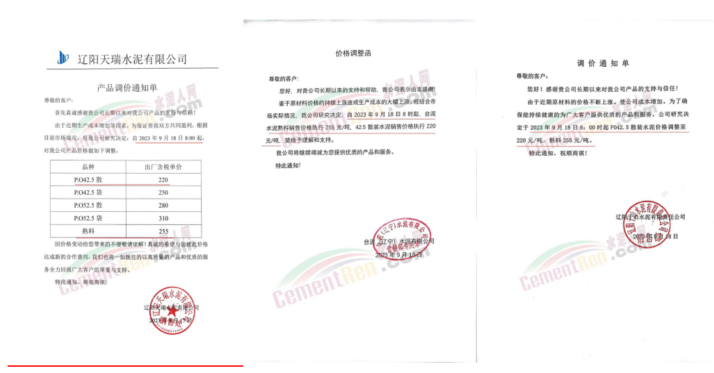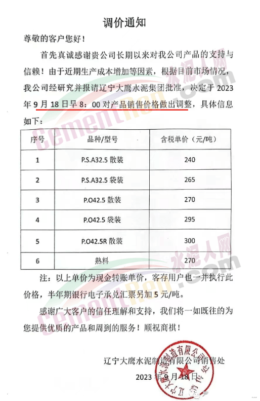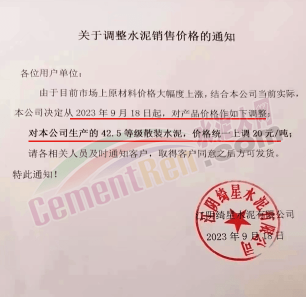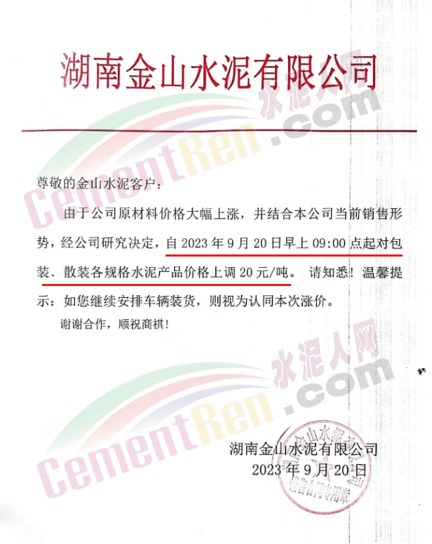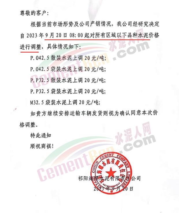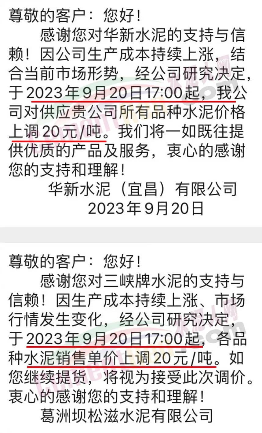 華新水泥(宜昌)公司、葛洲壩松滋水泥通知,因公司生產(chǎn)成本持續(xù)上漲,市場行情發(fā)生變化,經(jīng)公司研究決定于2023年9月20日17:00起,所有品種水泥價格上調(diào)20元/噸。