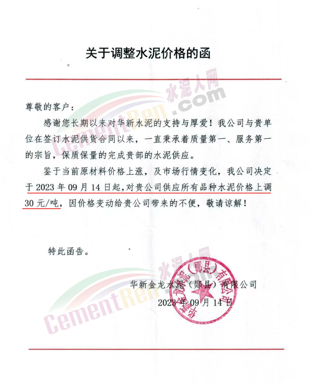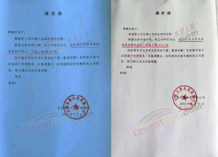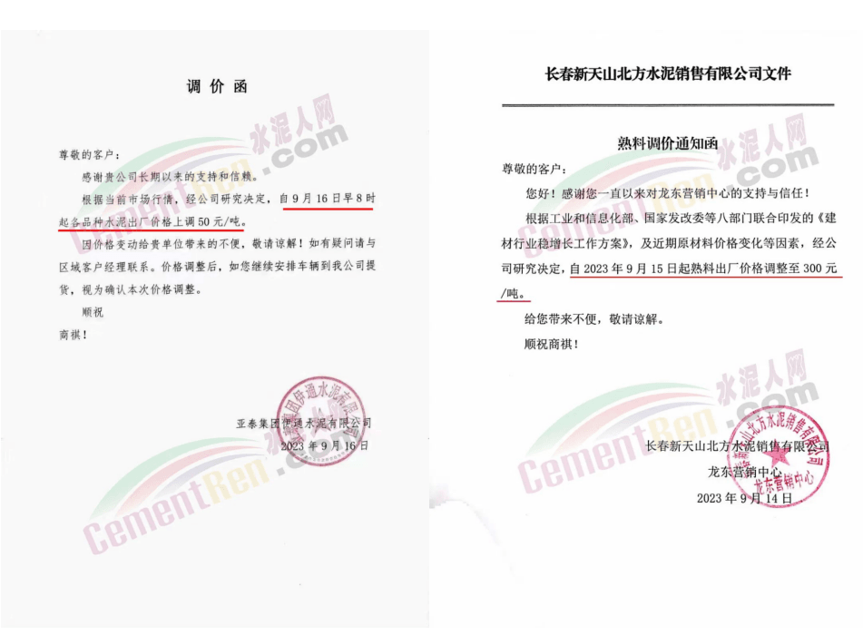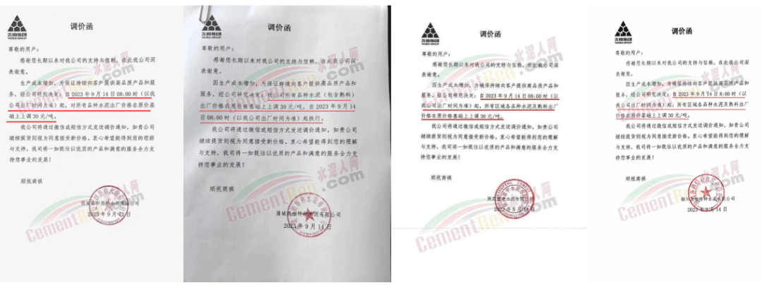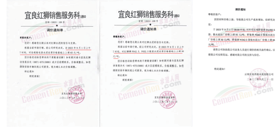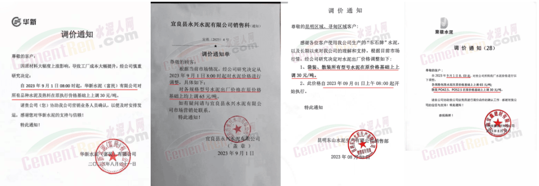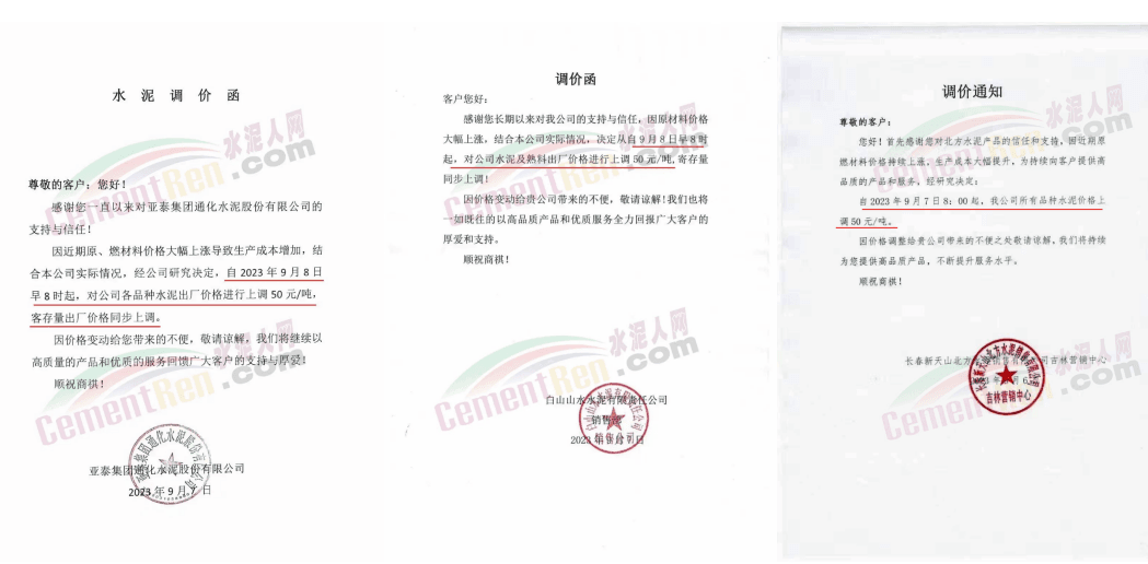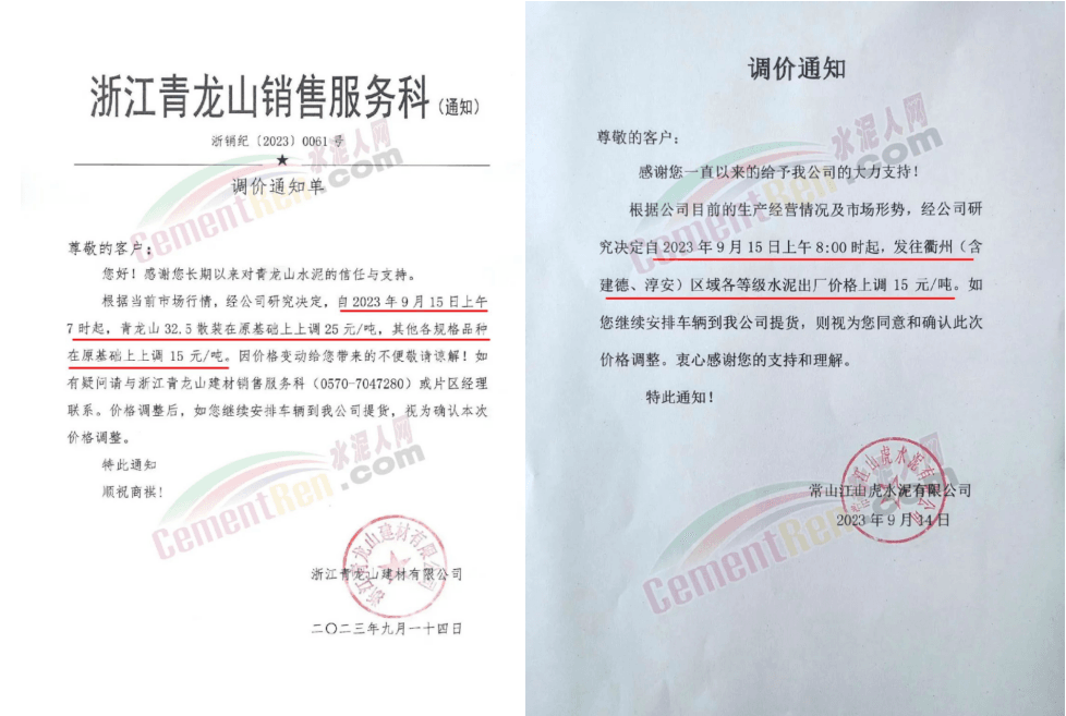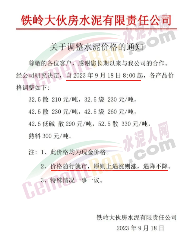 華新水泥(宜昌)公司、葛洲壩松滋水泥通知,因公司生產(chǎn)成本持續(xù)上漲,市場行情發(fā)生變化,經(jīng)公司研究決定于2023年9月20日17:00起,所有品種水泥價格上調(diào)20元/噸。