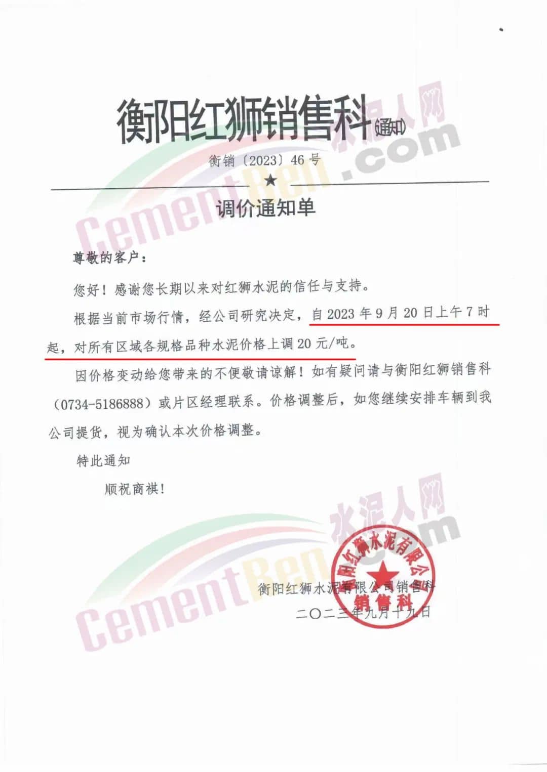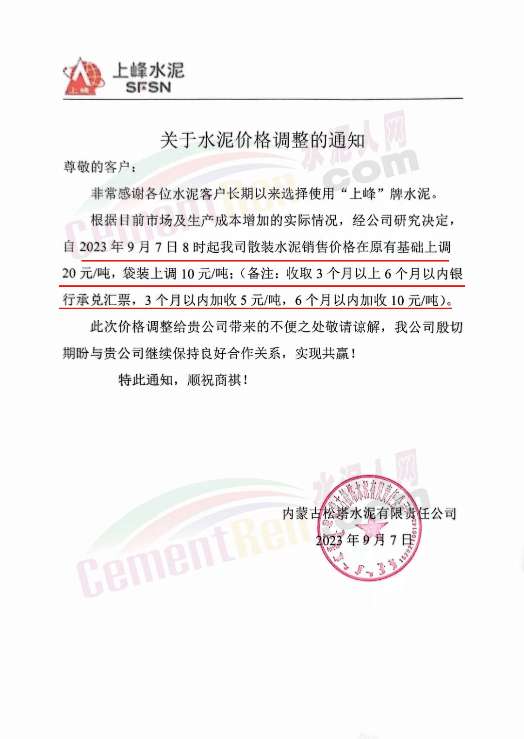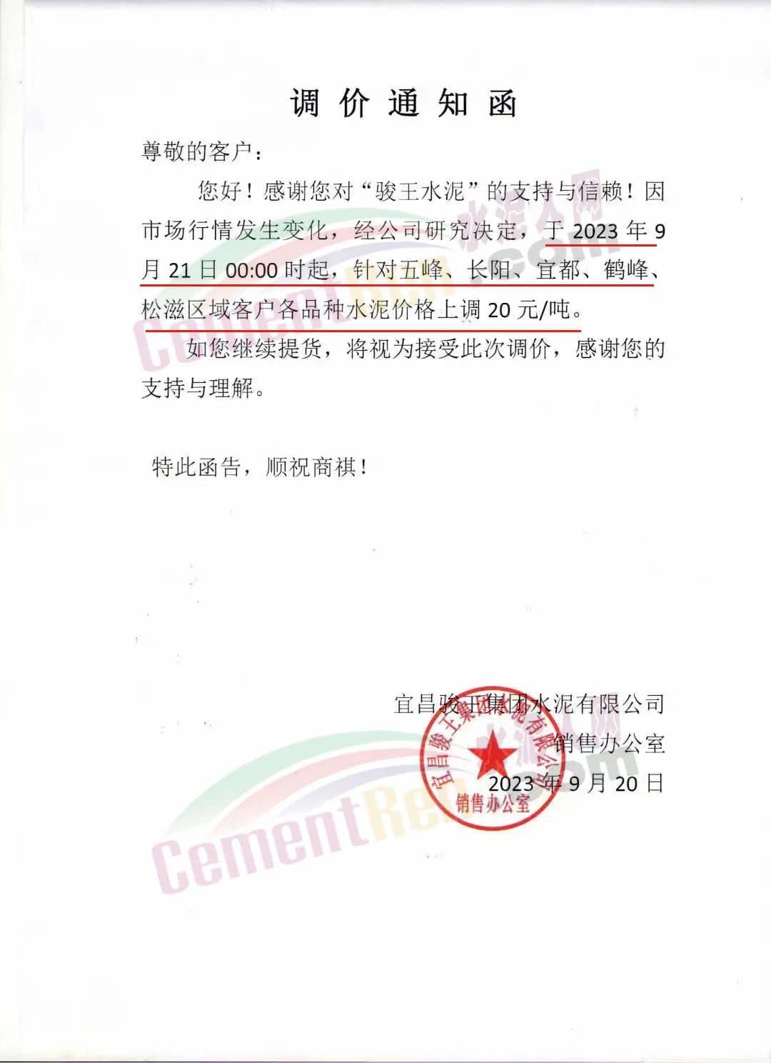 宜昌駿王水泥有限公司通知,因市場行情發(fā)生變化,經(jīng)公司研究決定,于2023年9月21日00:00時起,針對五峰、長陽、宜都、鶴峰、松滋區(qū)域客戶各品種水泥價格上調(diào)20元/噸。