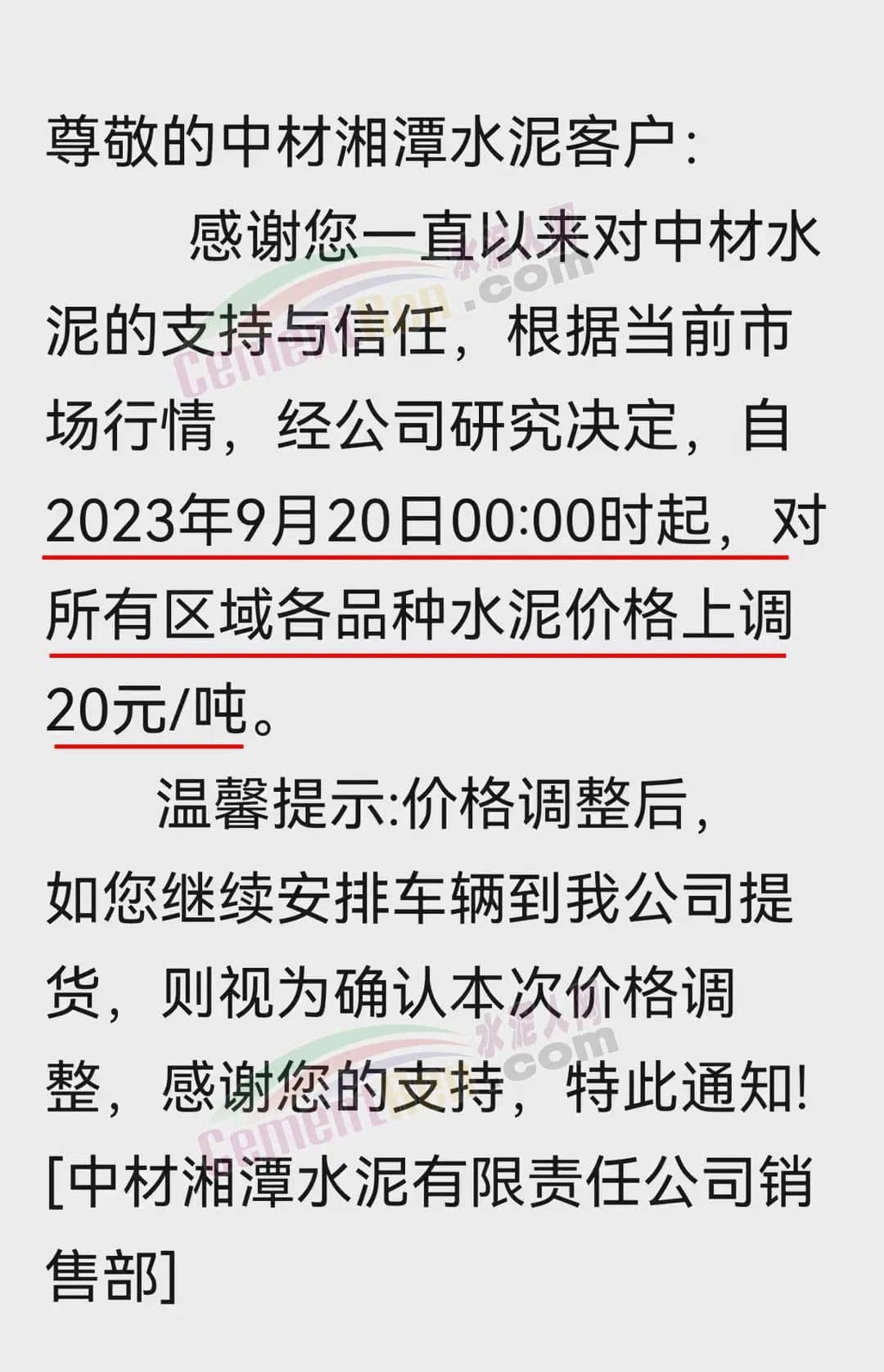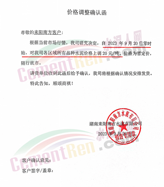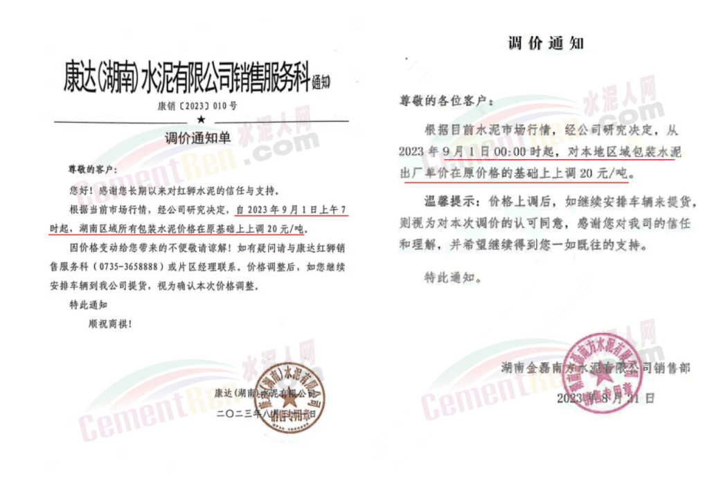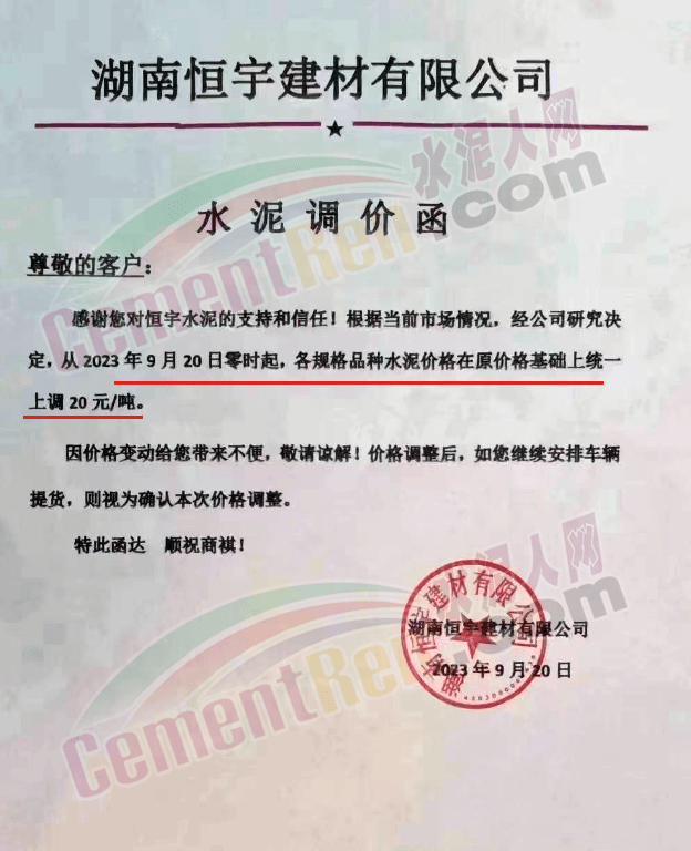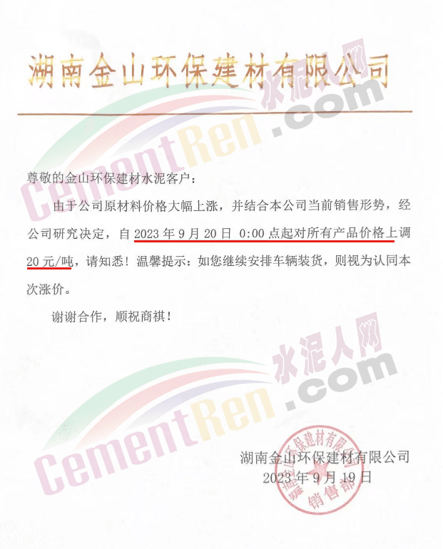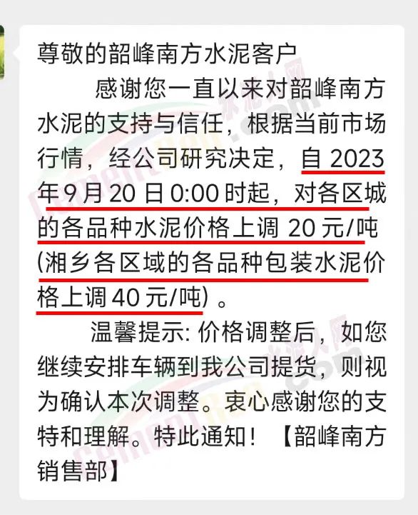 中南水泥旗下耒陽南方、寧鄉(xiāng)南方、瀏陽南方、桃江南方、坪塘南方、韶峰南方、中材湘潭水泥等多家企業(yè)通知,根據(jù)當(dāng)前市場行情,經(jīng)公司研究決定,從2023年9月20日0時起,對各區(qū)域、各品種的水泥出廠價在原基礎(chǔ)上上調(diào)20~40元/噸。