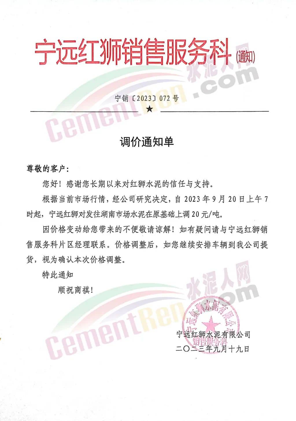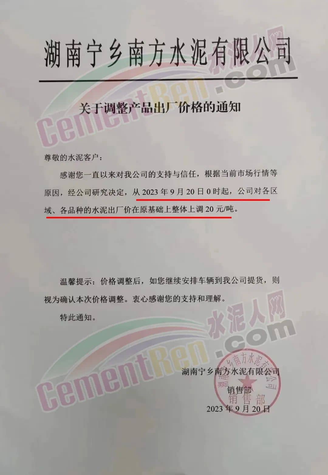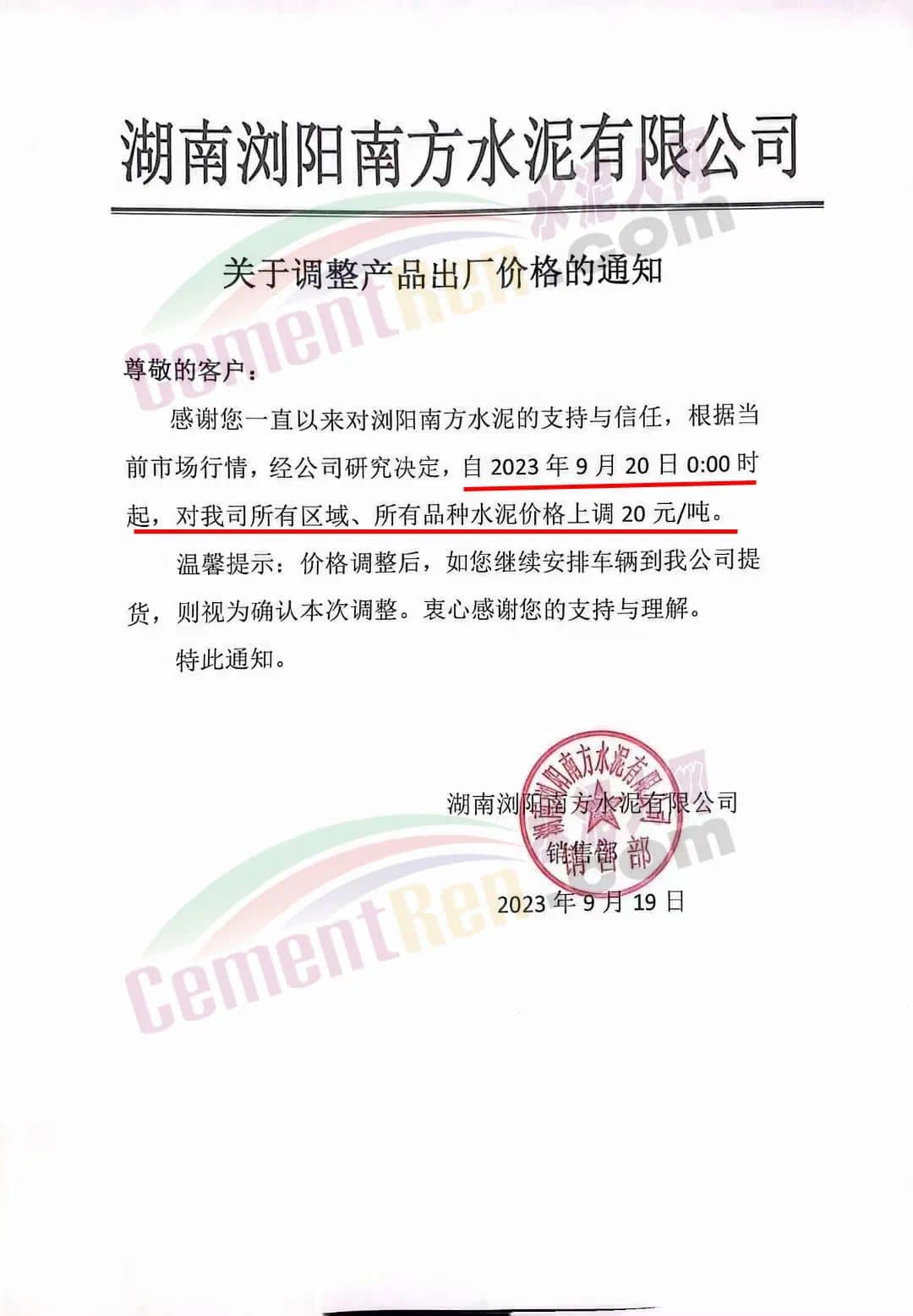 中南水泥旗下耒陽南方、寧鄉(xiāng)南方、瀏陽南方、桃江南方、坪塘南方、韶峰南方、中材湘潭水泥等多家企業(yè)通知,根據(jù)當(dāng)前市場行情,經(jīng)公司研究決定,從2023年9月20日0時起,對各區(qū)域、各品種的水泥出廠價在原基礎(chǔ)上上調(diào)20~40元/噸。