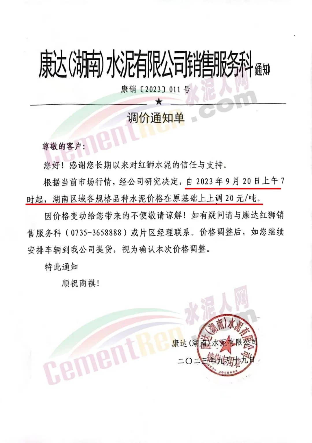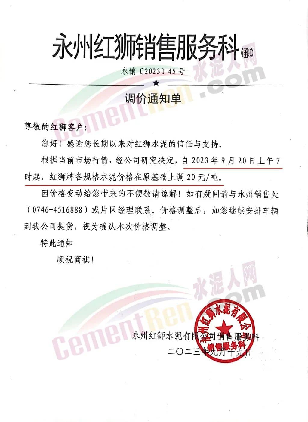 紅獅水泥旗下永州紅獅、寧遠(yuǎn)紅獅、衡陽紅獅、永州蓮花水泥、康達(dá)(湖南)水泥等多家企業(yè)通知,根據(jù)當(dāng)前市場行情,經(jīng)公司研究決定,自2023年9月20日上午7時起各規(guī)格水泥價格在原基礎(chǔ)上上調(diào)20元/噸。