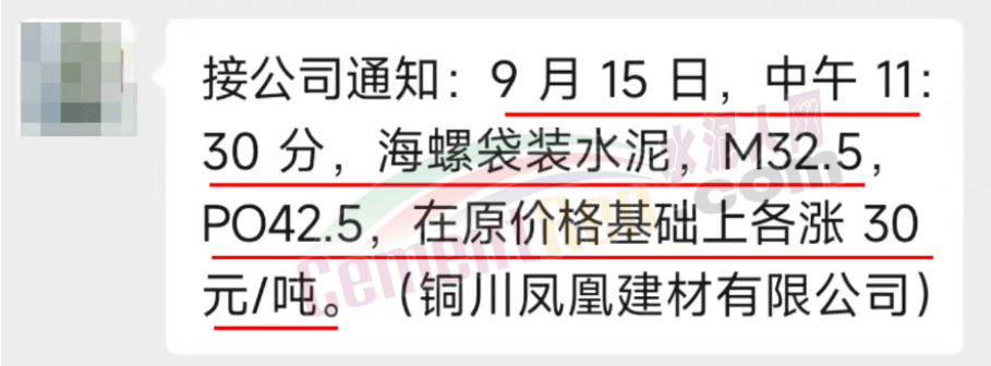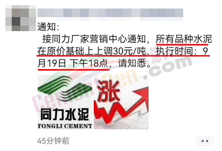 9月19日,河南區(qū)域主要品牌企業(yè)同力水泥、郟縣中聯(lián)水泥分別通知上調(diào)所有品種水泥價格30元/噸。