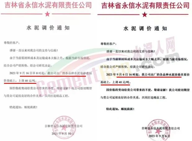 永信水泥分別于9月6日和16日通知上調(diào)水泥價格,累計上調(diào)80元/噸。