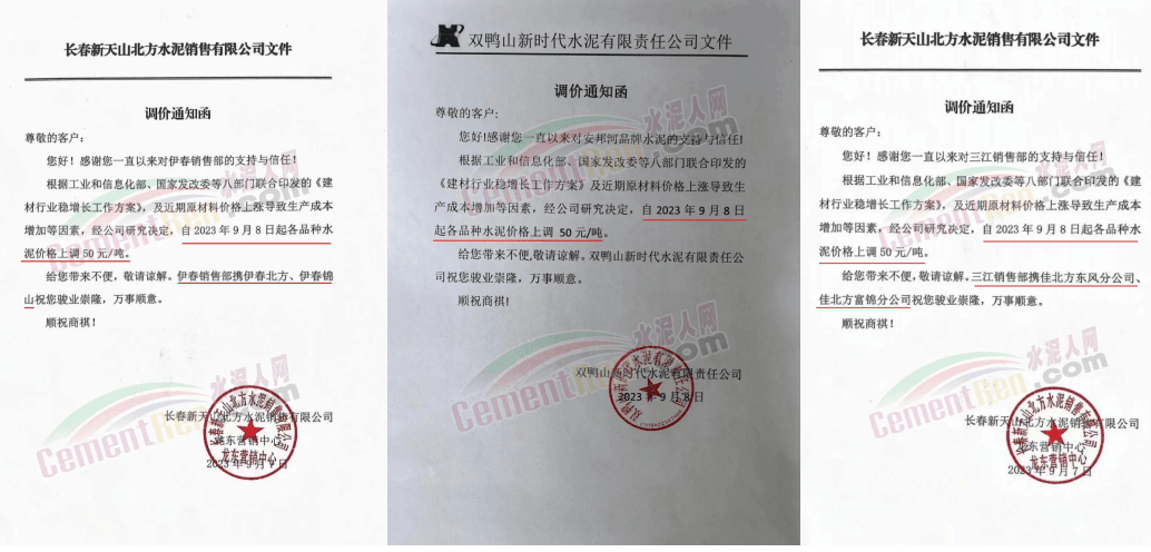 9月8日,雙鴨山新時代水泥、長春新天山北方水泥龍東營銷中心伊春銷售部、三江銷售部分別通知,各品種水泥價格上調(diào)50元/噸。