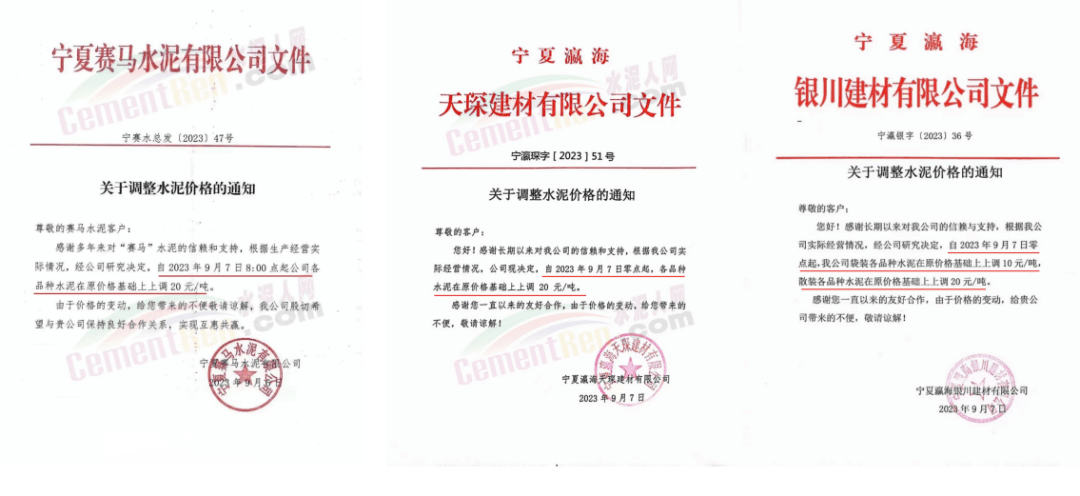 寧夏賽馬、瀛海天琛建材、瀛海銀川建材等企業(yè)上調(diào)水泥價格20元/噸