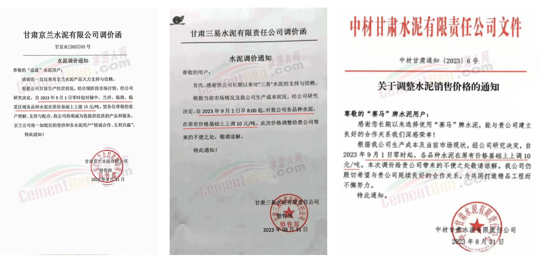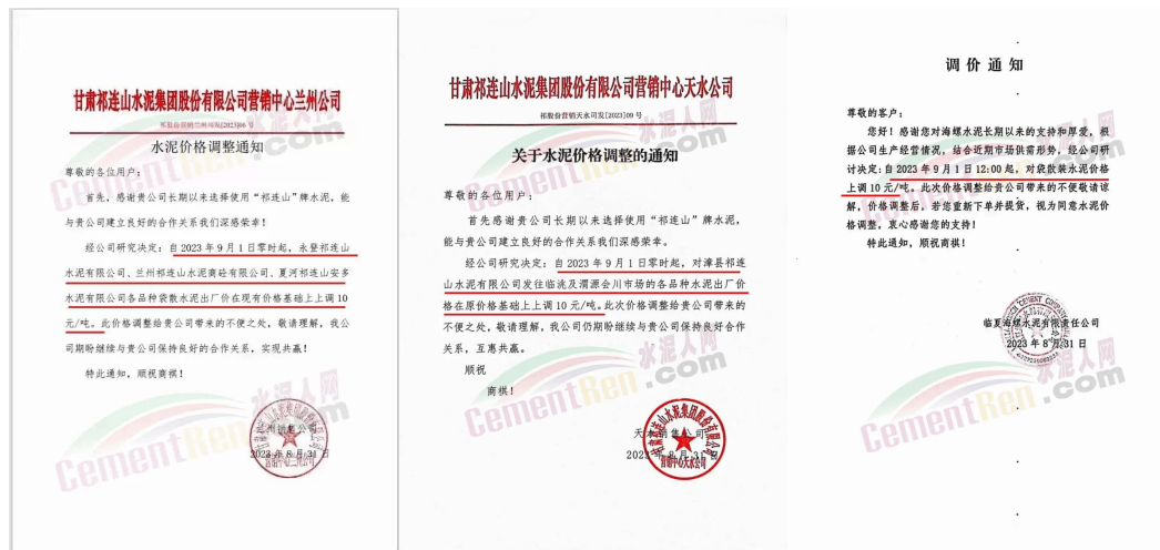 9月1日,甘肅祁連山水泥蘭州公司通知永登祁連山水泥、蘭州祁連山水泥商砼、夏河祁連山安多水泥各品種水泥出廠價在現(xiàn)有價格基礎(chǔ)上上調(diào)10元/噸。同日,臨夏海螺水泥、中材甘肅水泥、甘肅京蘭水泥、甘肅三易水泥等企業(yè)通知上調(diào)榆中、蘭州、臨洮、臨夏等多區(qū)域水泥報價10~20元/噸。