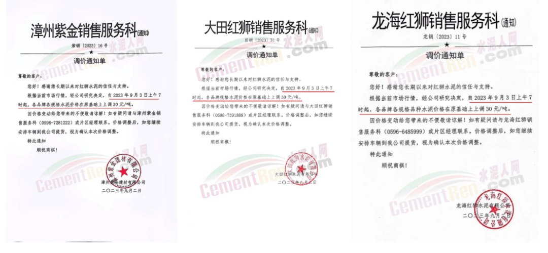 其中,紅獅水泥旗下漳州紫金水泥、龍海紅獅、大田紅獅銷售服務(wù)科通知,各品牌各規(guī)格品種水泥價格在原基礎(chǔ)上上調(diào)30元/噸。