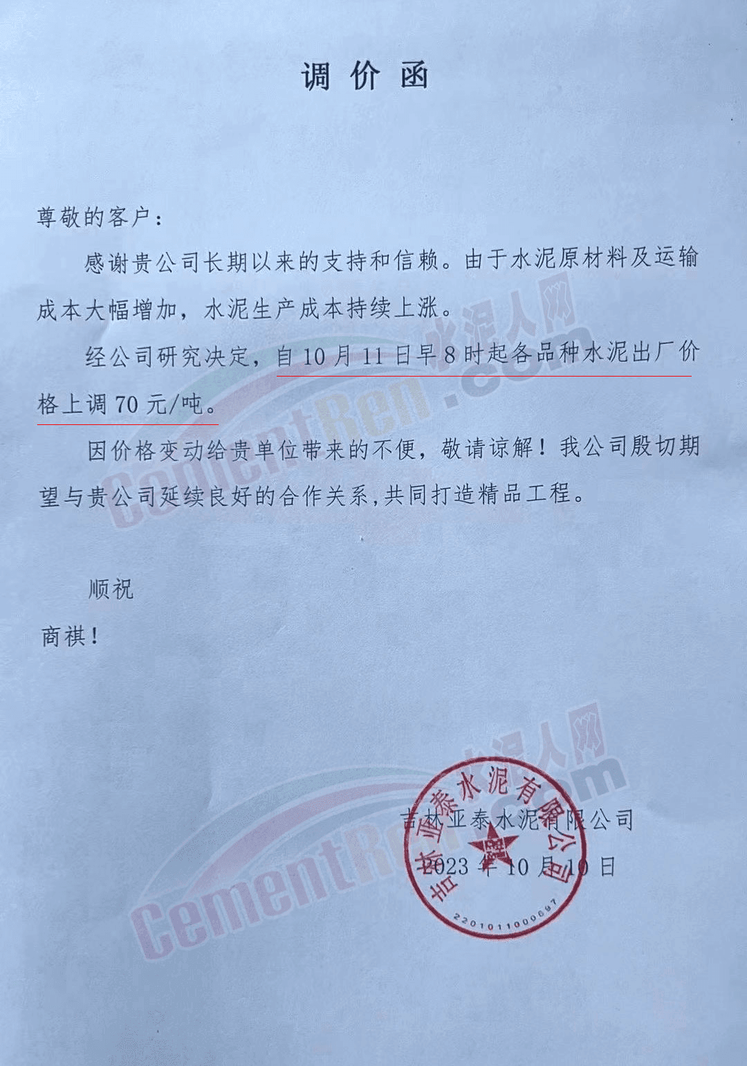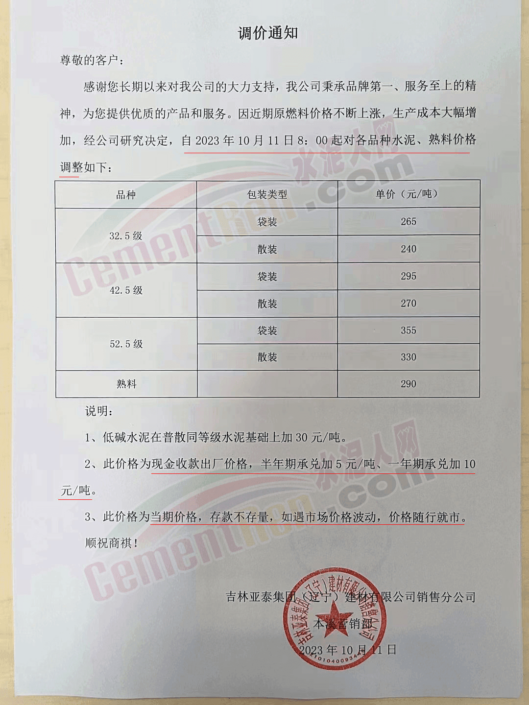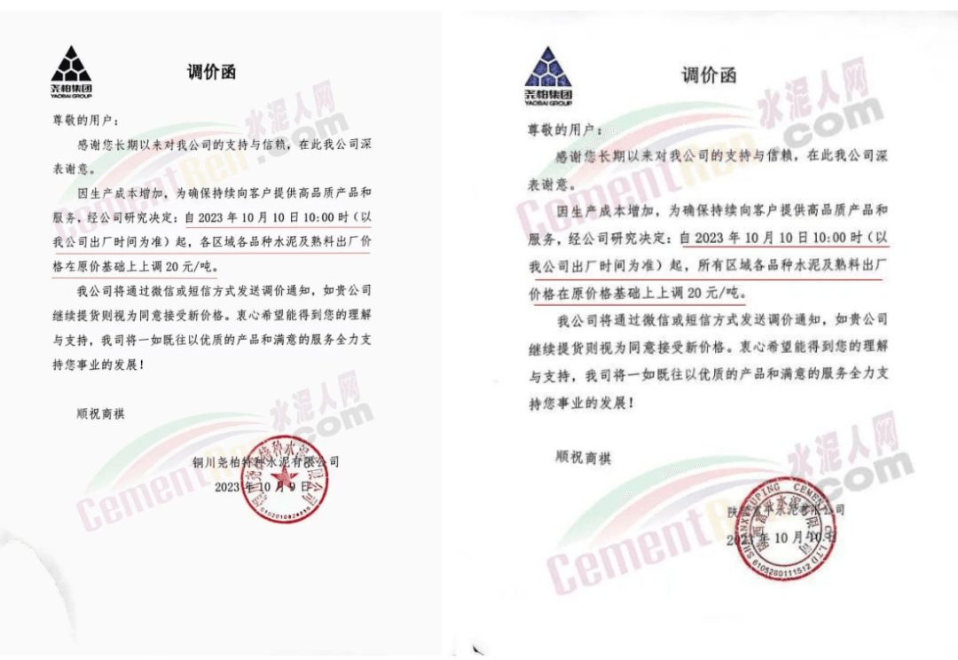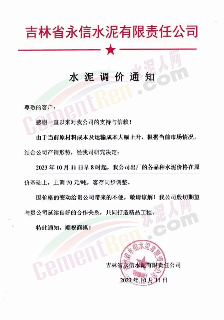 吉林區(qū)域,亞泰、北方、金隅冀東等企業(yè)通知上調(diào)水泥、熟料價(jià)格50-70元/噸。