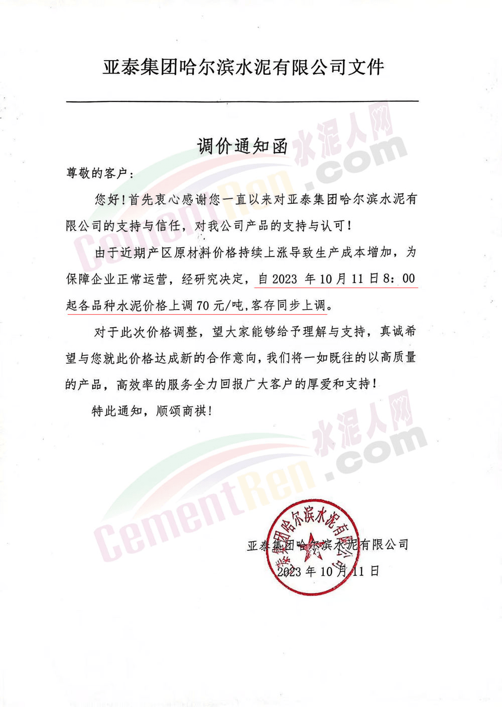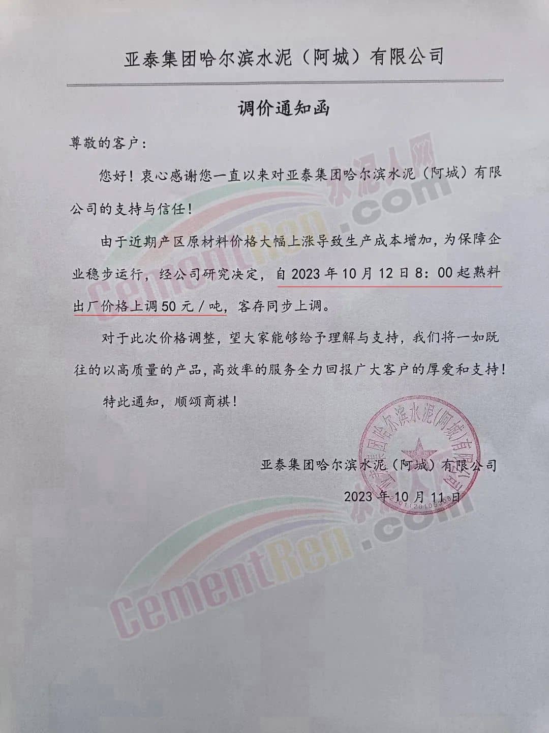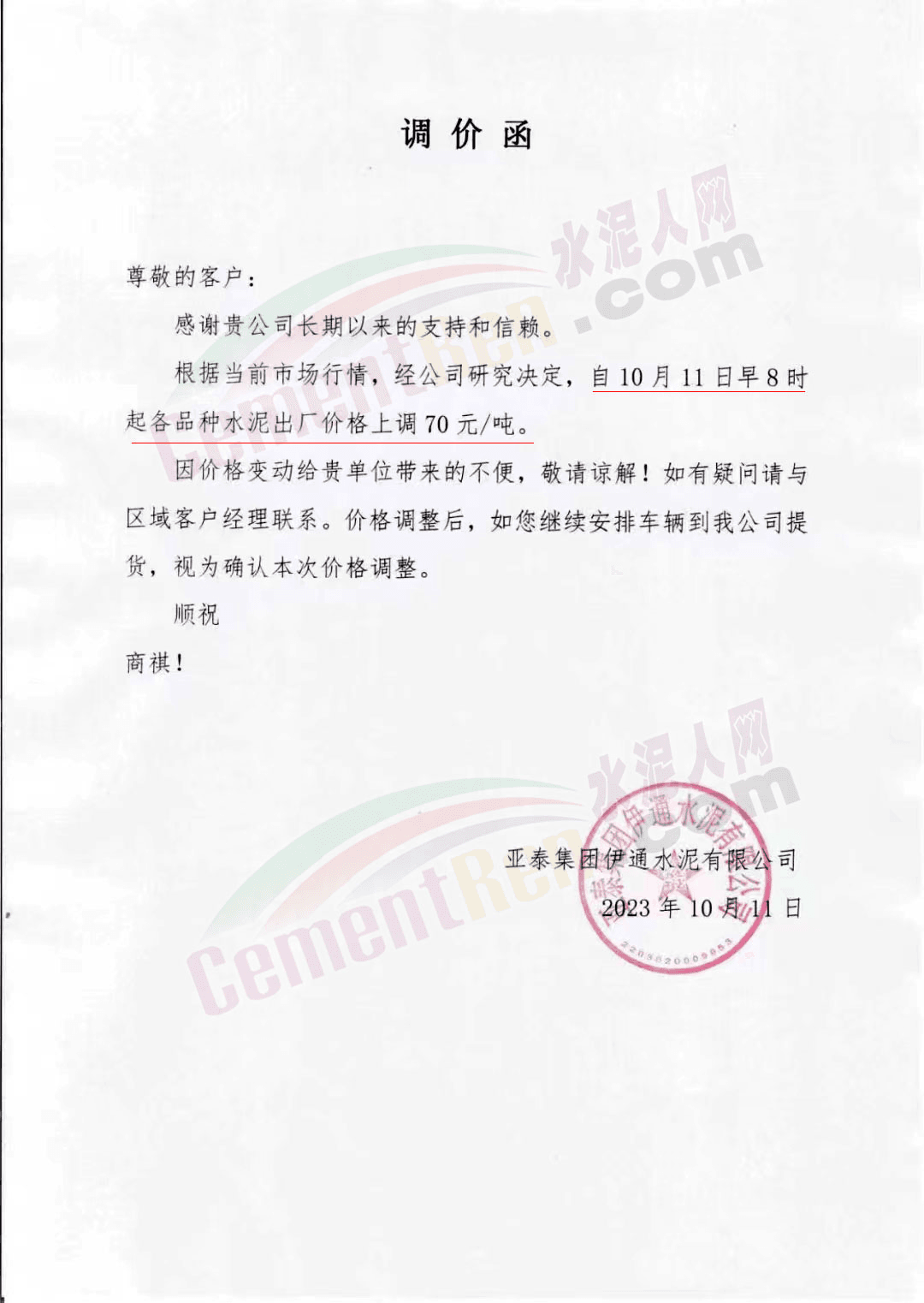 吉林區(qū)域,亞泰、北方、金隅冀東等企業(yè)通知上調(diào)水泥、熟料價(jià)格50-70元/噸。