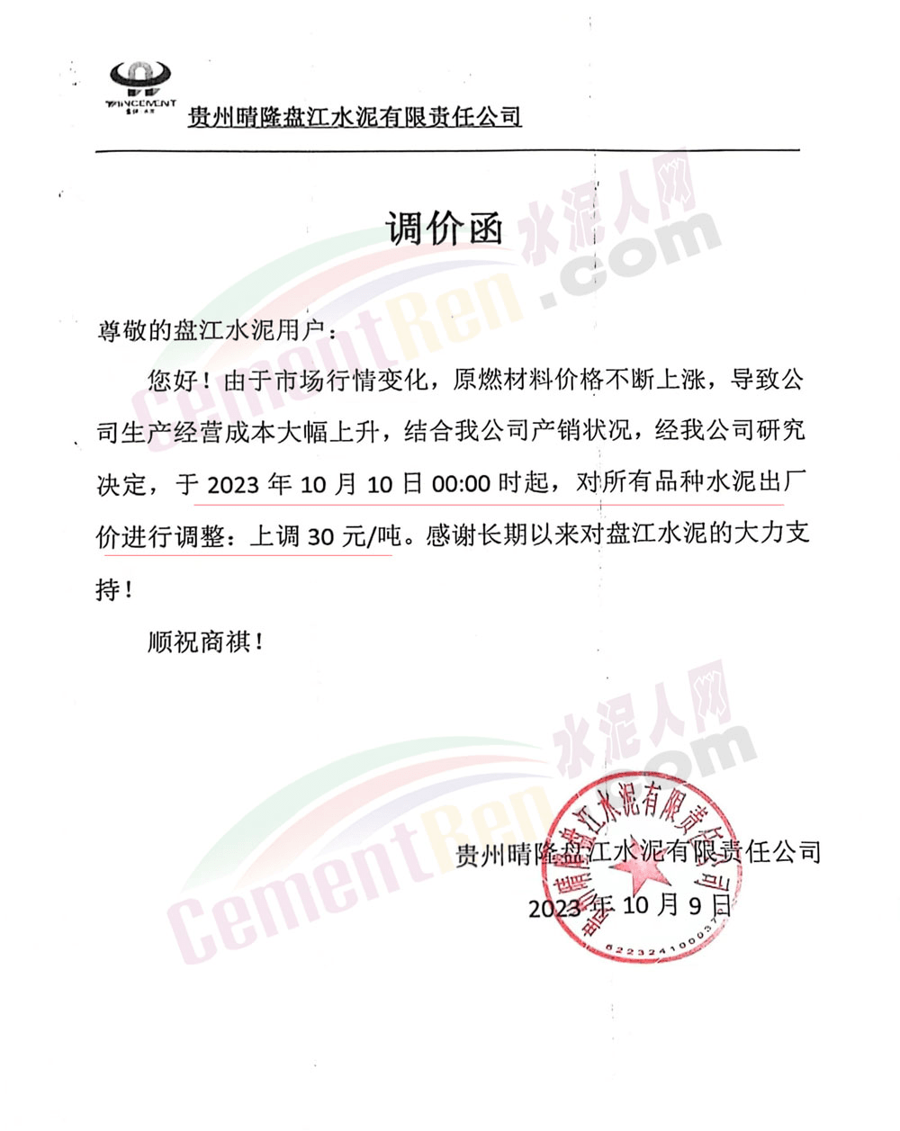 貴州區(qū)域多家企業(yè)通知上調(diào)水泥報(bào)價(jià)30元/噸。