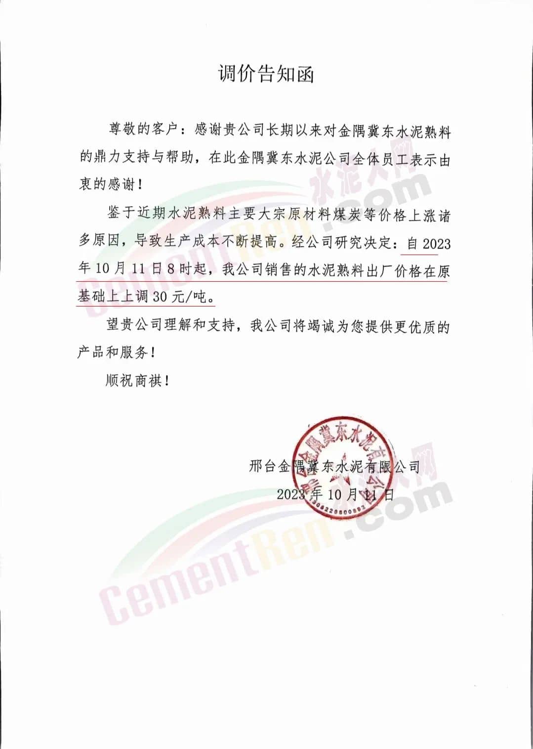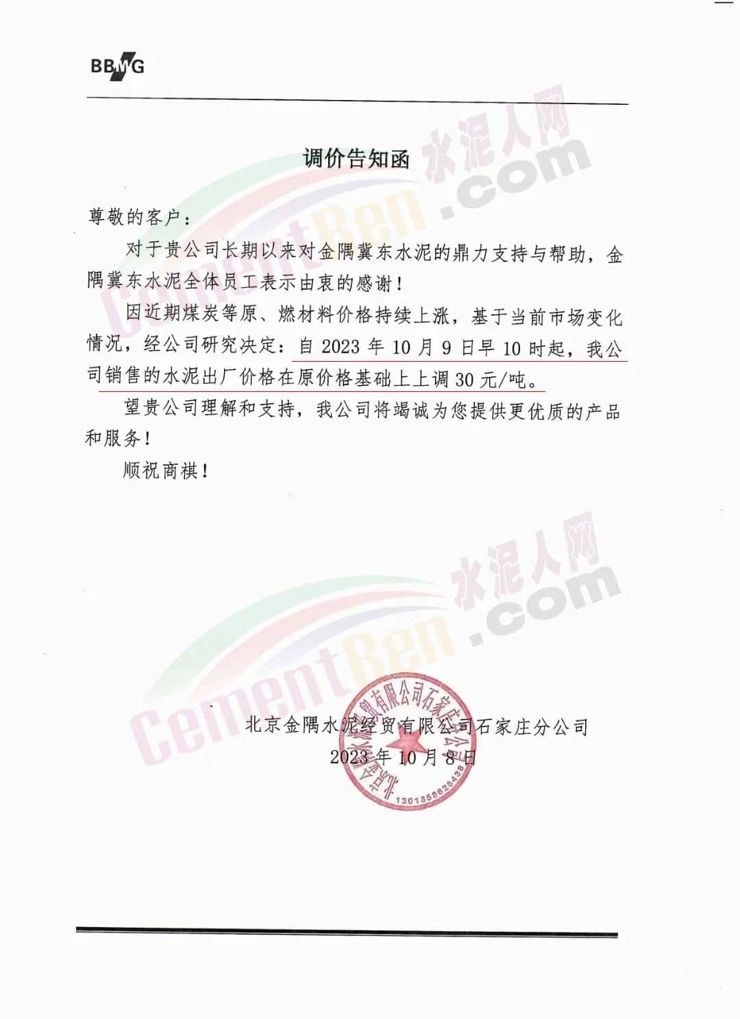 京津冀地區(qū),北京金隅水泥石家莊分公司、邢臺(tái)金隅冀東水泥有限公司、邢臺(tái)金隅詠寧水泥有限公司等主要品牌企業(yè)通知上調(diào)水泥、熟料報(bào)價(jià)30元/噸。