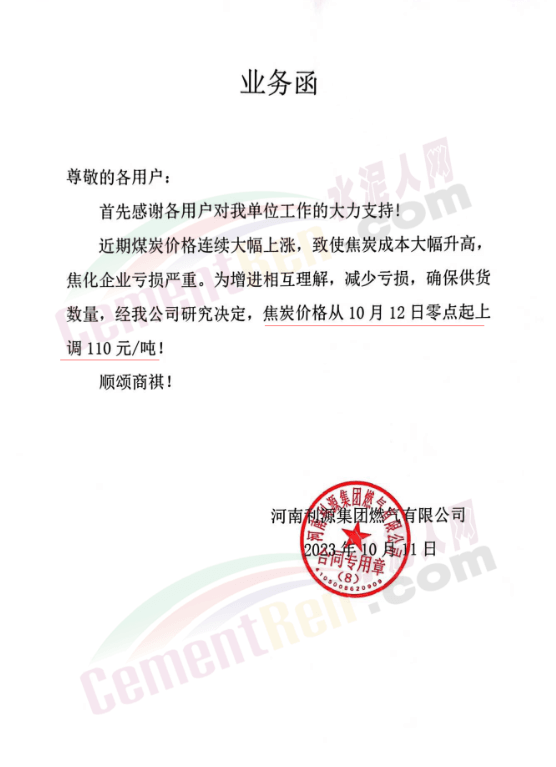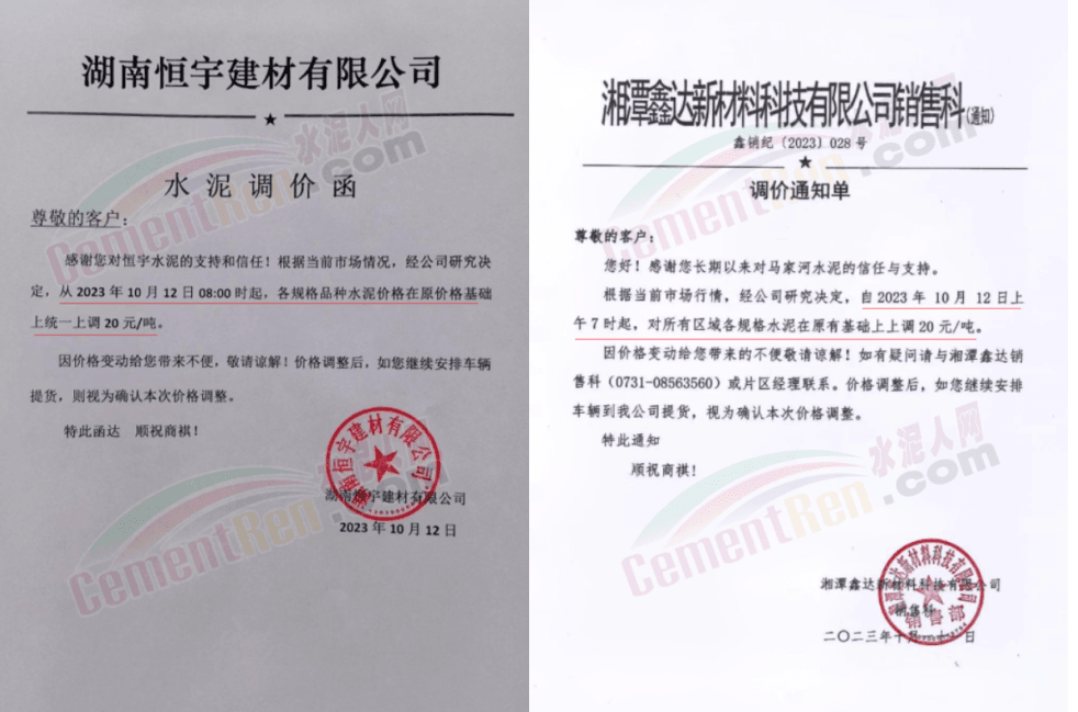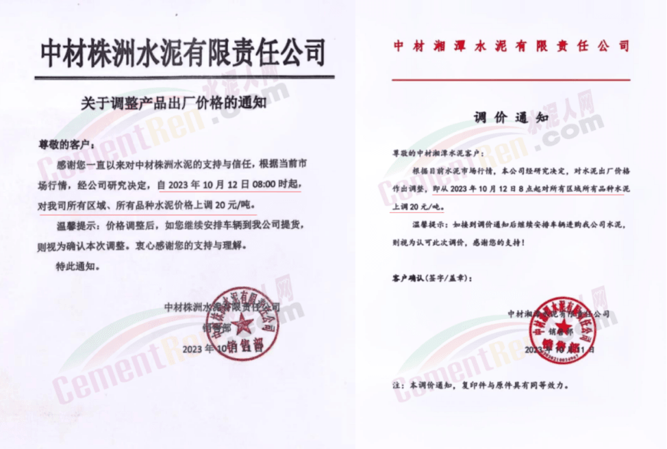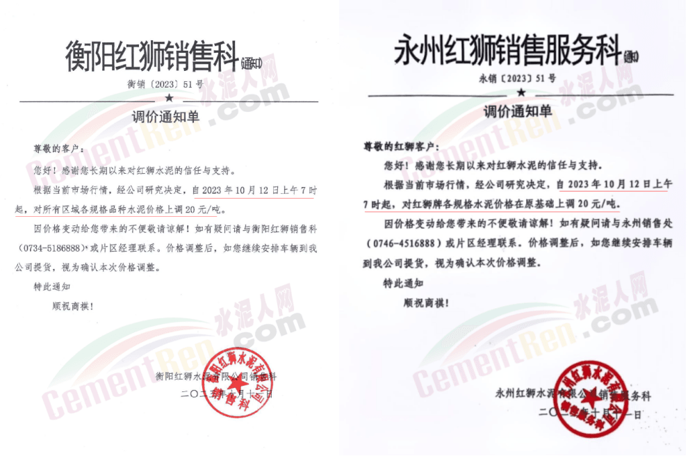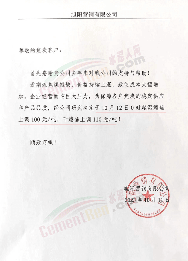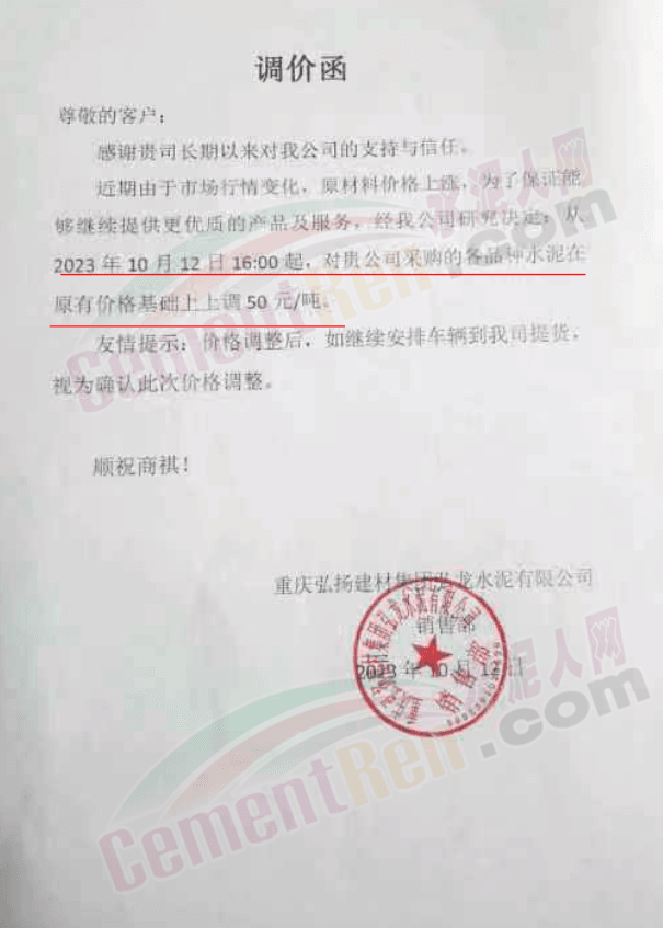 重慶弘揚(yáng)建材集團(tuán)衛(wèi)龍水泥有限公司通知稱,近期由于市場行情變化,原材料價(jià)格上漲,為了保證能夠繼續(xù)提供優(yōu)質(zhì)的產(chǎn)品及服務(wù),經(jīng)公司研究決定,從10月12日16時(shí)起,對公司采購的各品種水泥在原有價(jià)格基礎(chǔ)上上調(diào)50元/噸。