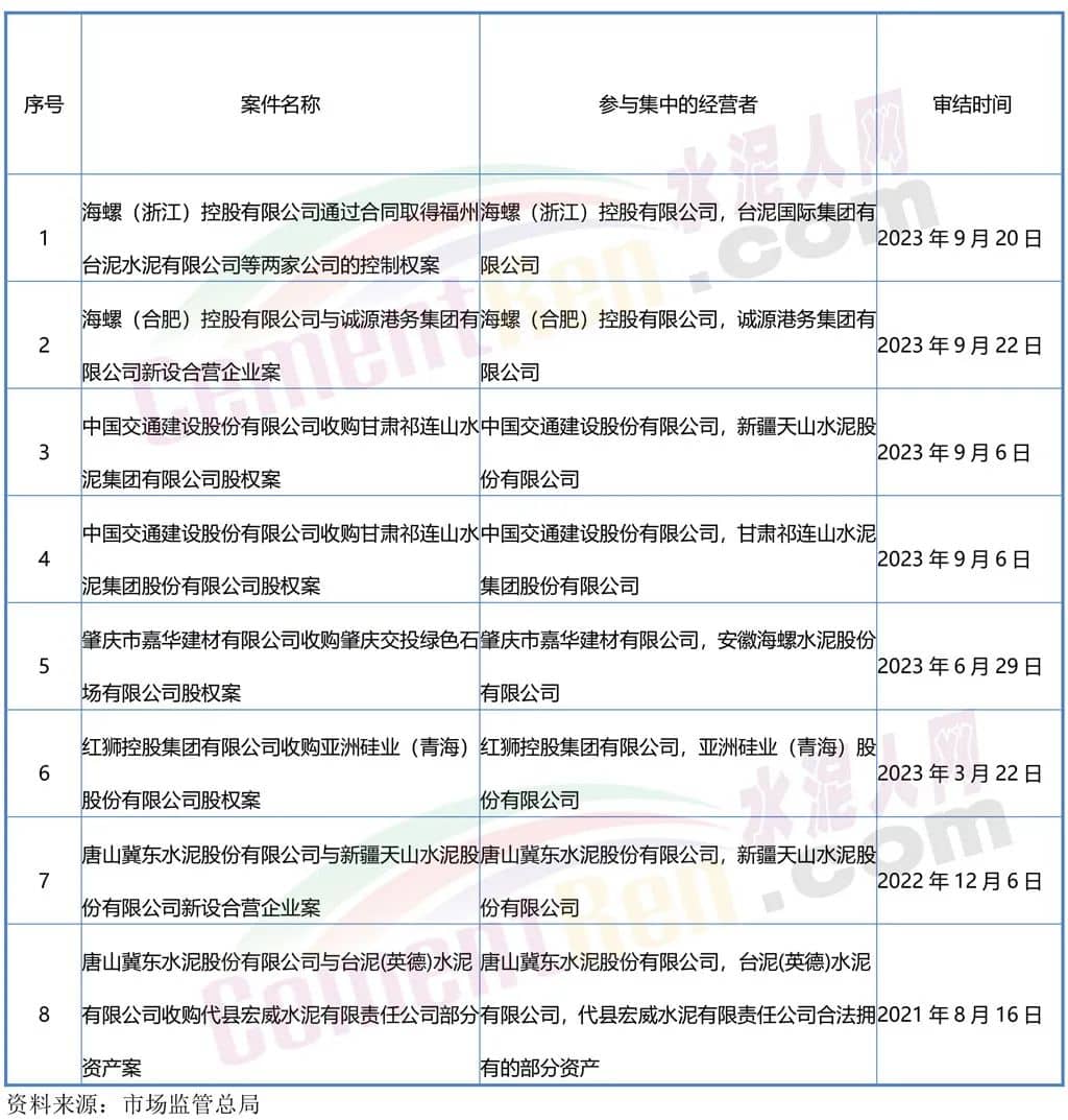 近幾年來(lái),市場(chǎng)監(jiān)管總局公布了多起《無(wú)條件批準(zhǔn)經(jīng)營(yíng)者集中案》其中涉及水泥行業(yè)頭部企業(yè)天山水泥、海螺水泥、冀東水泥、臺(tái)泥水泥、紅獅水泥、祁連山水泥共8例。