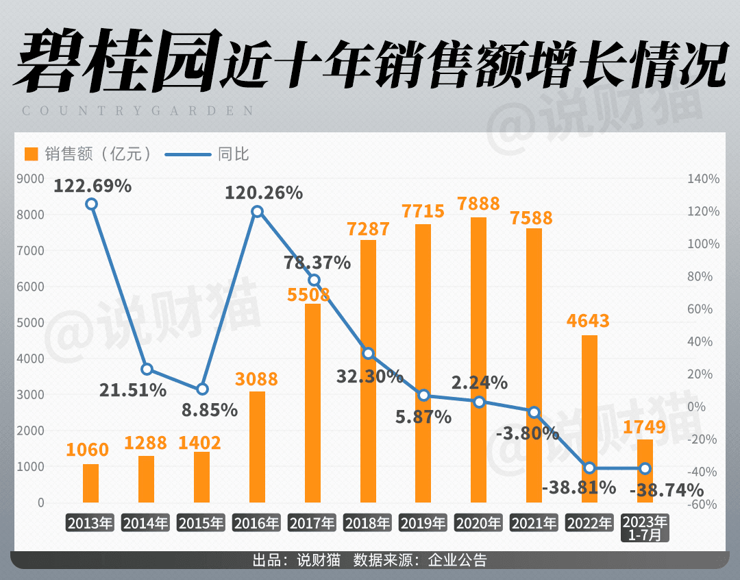 碧桂園近幾年房產(chǎn)售價持續(xù)下滑,僅2020到2022年,碧桂園全國折合均價持續(xù)下降,分別為8402元/平方米、8033元/平方米、7886元/平方米,但2022年,碧桂園銷售額仍然大跌38.81%,減少了近3000億,交出了并不完美的答卷。2023年上半年更是巨虧514.61億,可謂是生存艱難。