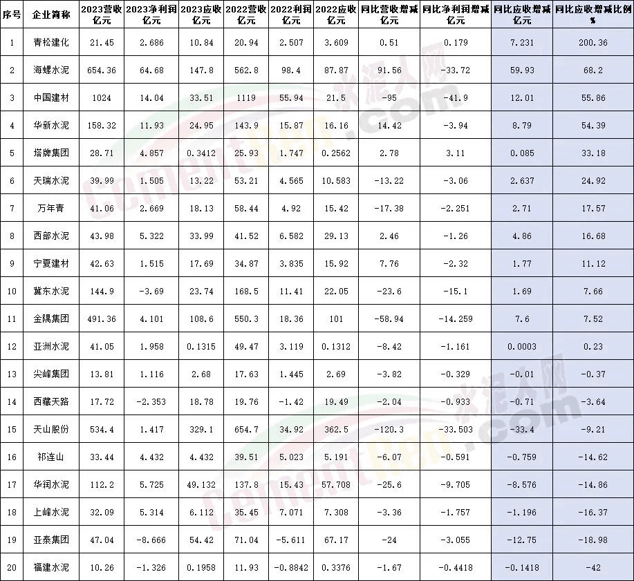 今年上半年各企業(yè)公布的半年報可見,20家上市企業(yè)中12家應(yīng)收賬款增加,占比達(dá)60%。其中海螺水泥2023年上半年同比2022年同期應(yīng)收賬款及票據(jù)增加59.93億元,增幅達(dá)68.2%。同期營業(yè)收入增加91.56億元,凈利潤減少33.72億元,增收不增利的情況明顯。