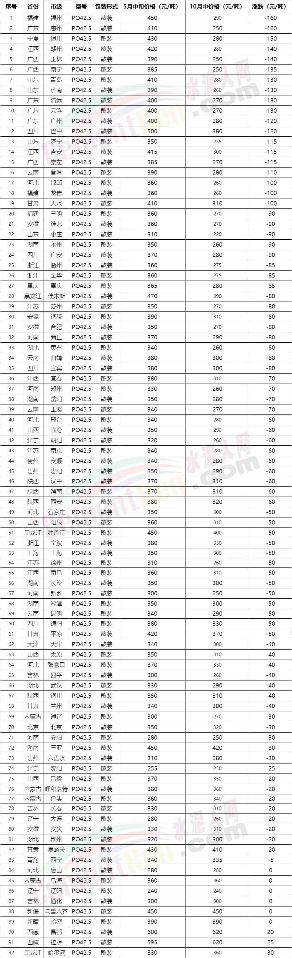 19個地區(qū)水泥價格同比下跌超過100元/噸