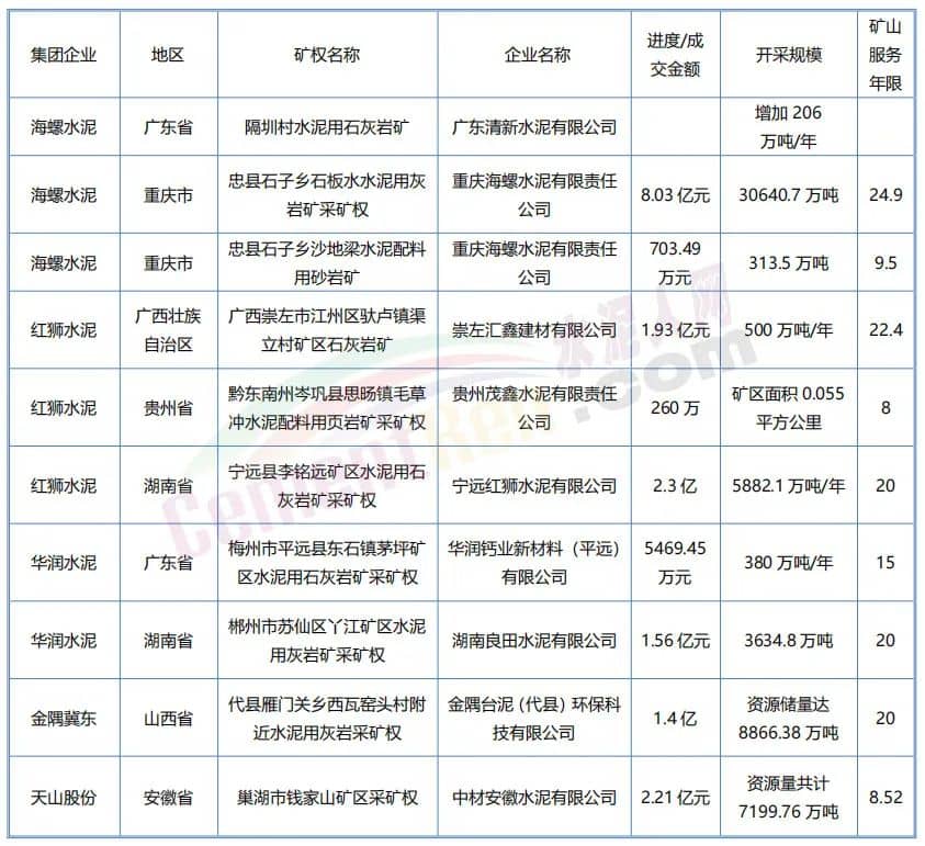 據(jù)水泥人網(wǎng)了解,今年以來行業(yè)頭部企業(yè)海螺水泥、紅獅水泥、金隅冀東、天山股份等企業(yè)均有在各地拿礦,擴充現(xiàn)有產(chǎn)能資源。
