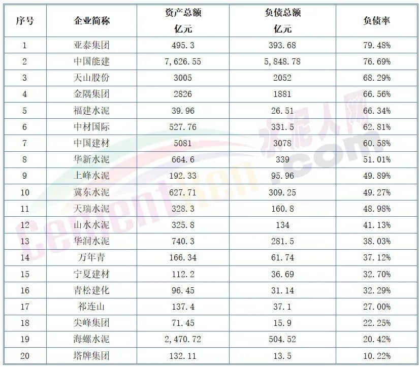 近期水泥行業(yè)各大上市公司先后發(fā)布了今年前三季度業(yè)績報(bào)告。其中亞泰集團(tuán)、中國能建、天山股份、金隅集團(tuán)、福建水泥、中材國際、中國建材等負(fù)債率超過50%。