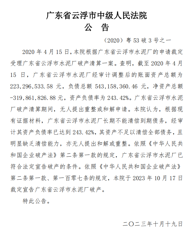 資產(chǎn)負(fù)債率為243.42%,云浮水泥廠宣告破產(chǎn)