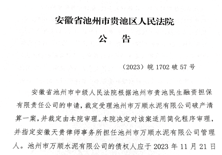 10月19日,安徽省池州市貴池區(qū)人民法院公告稱,安徽省池州市中級(jí)人民法院根據(jù)池州市貴池民生融資擔(dān)保有限責(zé)任公司的申請(qǐng),裁定受理池州市萬順?biāo)嘤邢薰酒飘a(chǎn)清算一案。