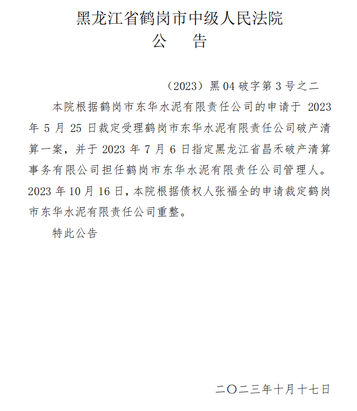 鶴崗市東華水泥有限責(zé)任公司被申請(qǐng)破產(chǎn)重整