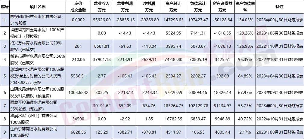 除已宣告破產(chǎn)的企業(yè)外,另有部分企業(yè)公開出讓股權(quán)。其披露信息顯示,資產(chǎn)負(fù)債率達(dá)100%以上。其中,國投印尼巴布亞水泥有限公司2023年09月30日財(cái)務(wù)報(bào)表顯示,資產(chǎn)負(fù)債率達(dá)134.03%。海螺水泥持股比例達(dá)49%,為其第二大股東。企業(yè)負(fù)債總計(jì)達(dá)19.74億,所有者權(quán)益為-5.01億,51%股權(quán)以2元底價(jià)出售。