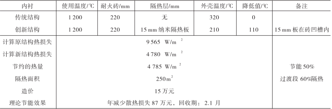 該生產(chǎn)線應(yīng)用15 mmWDS納米隔熱板點(diǎn)火投產(chǎn)10天后,在回轉(zhuǎn)窯正常生產(chǎn)中,回轉(zhuǎn)窯外殼溫度掃描35~63 m處全是綠色的低溫區(qū)域,兩個銜接的區(qū)域之間沒有一點(diǎn)過渡顏色,充分體現(xiàn)了凹槽磚復(fù)合納米隔熱板的隔熱效果,相比傳統(tǒng)隔熱方法筒體表面溫度下降110 ℃,散熱損失減少4785W/m2,年減少散熱損失87萬元,約2月左右即可收回投資。