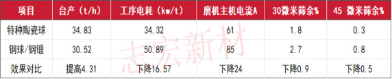 金華GF超細粉磨主要設(shè)備為3.2×13米的球磨機,磨機主電機1600kw。磨機第二倉鋼段全部更換為第三代特種陶瓷球(簡稱:特種陶瓷球,下同)后,臺產(chǎn)提高10%以上,電耗降低16.57度/噸,磨機主電機電流下降24A,30微米篩余下降50%以上,45微米篩余下降33%;按節(jié)省電耗計算投資回收期7-8個月,綜合考慮提高臺產(chǎn)和提高超細粉質(zhì)量等新增經(jīng)濟效益計算投資回收期5-6個月。